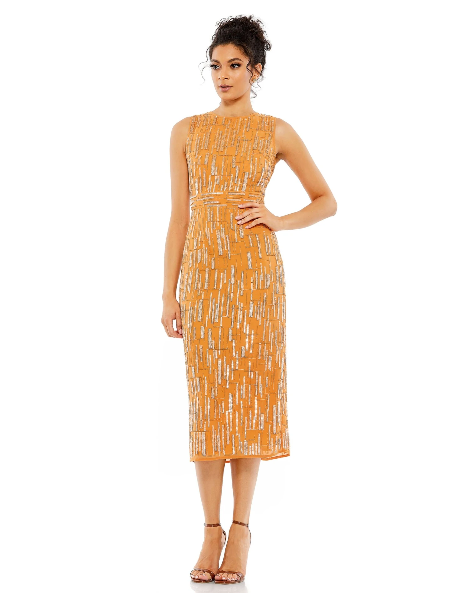 Chic sleeveless midi dress embellished with stripe-patterned sequins and beading.