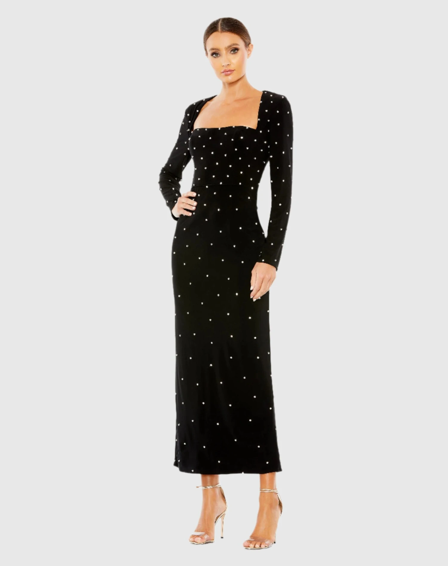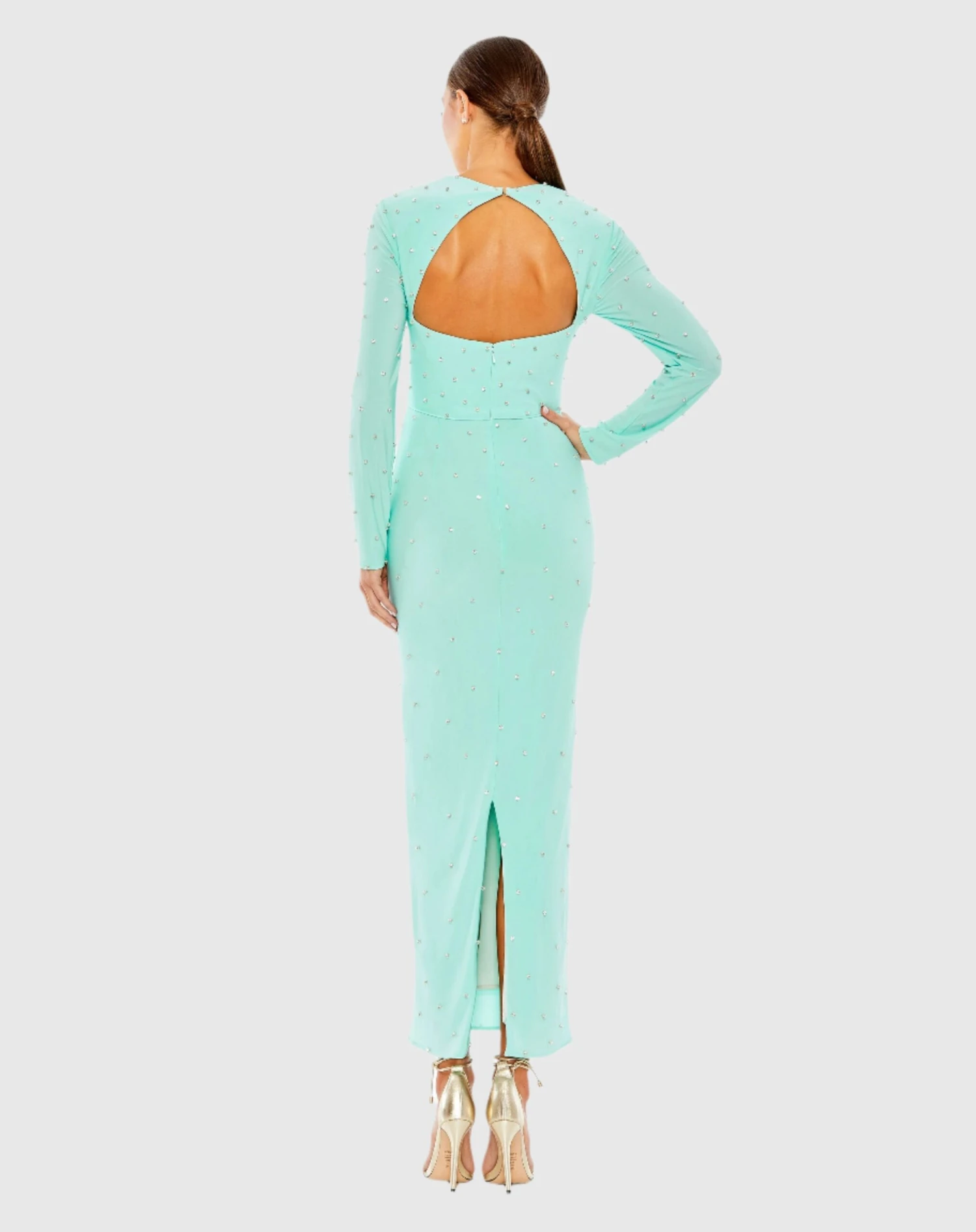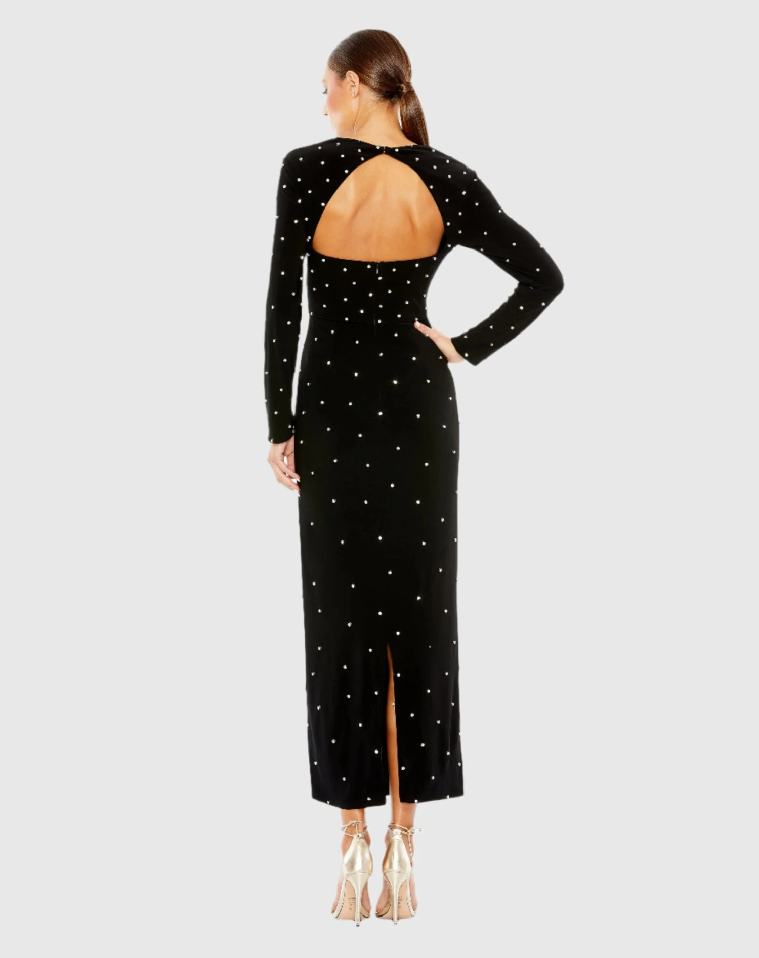 This sultry sheath is cut in a modest ankle-length, long-sleeve silhouette and detailed with luxe rhinestones that add beautiful sparkle to the piece. A deep square neckline and padded shoulders command attention, while a cutout back lends a fashion-forward finish.