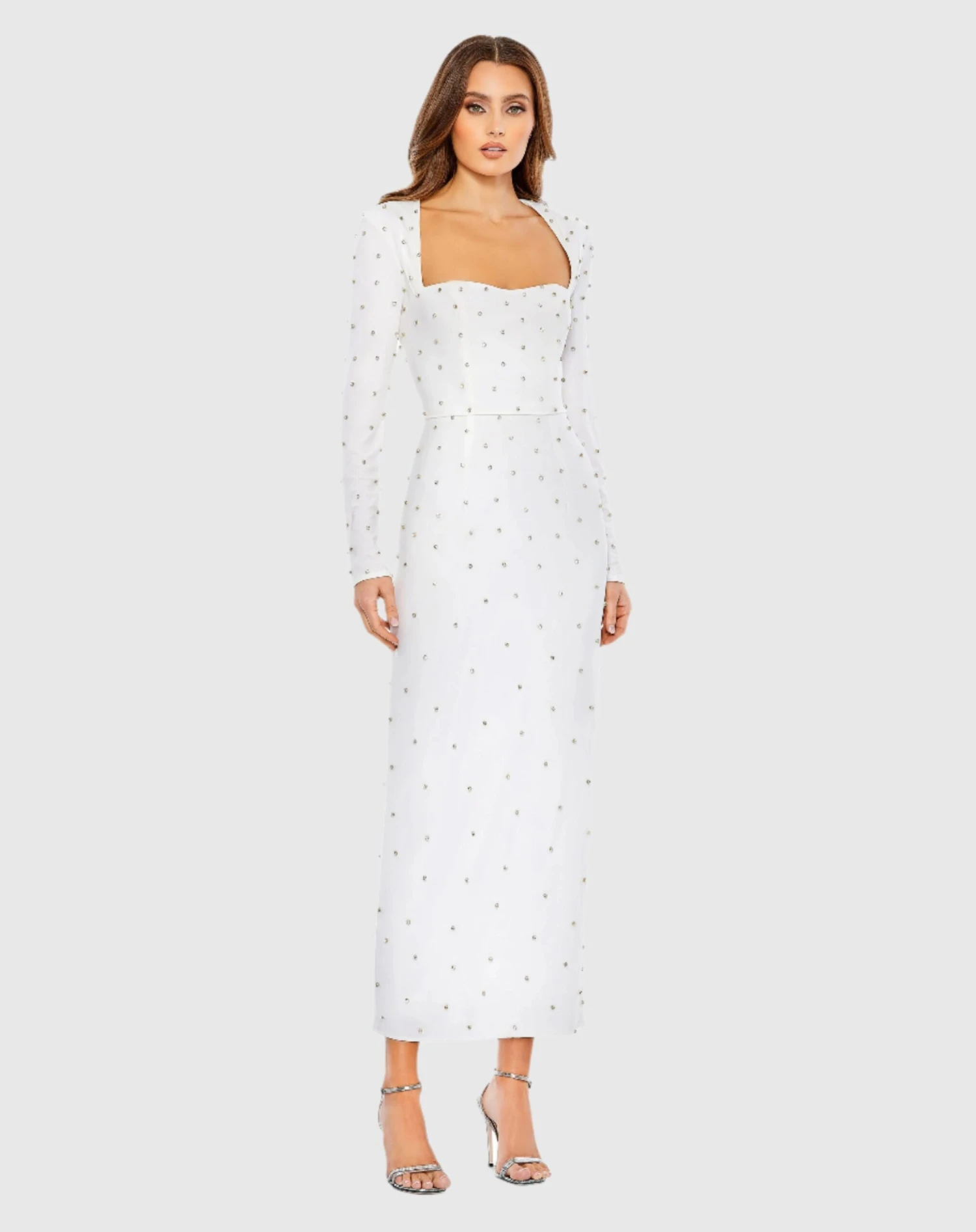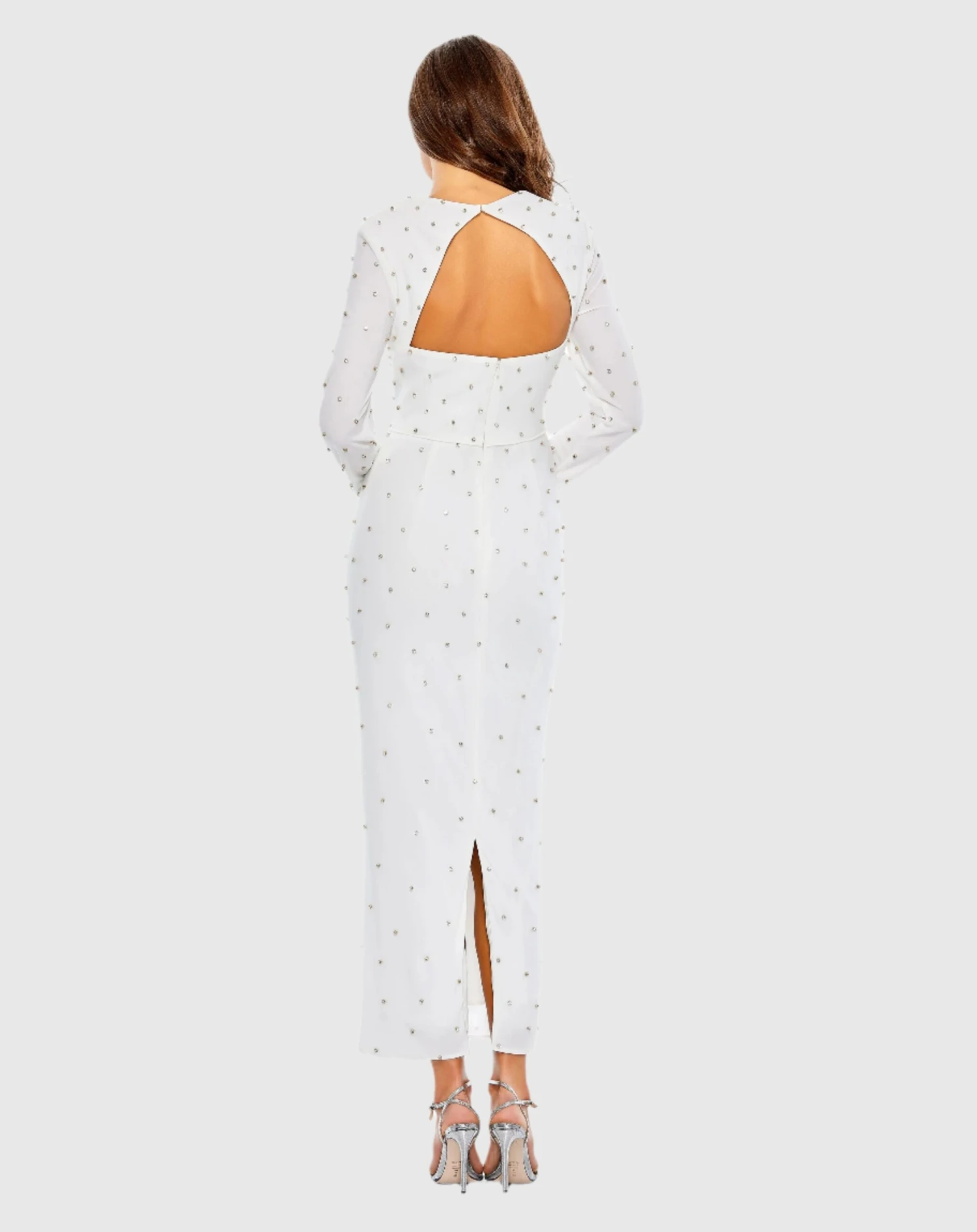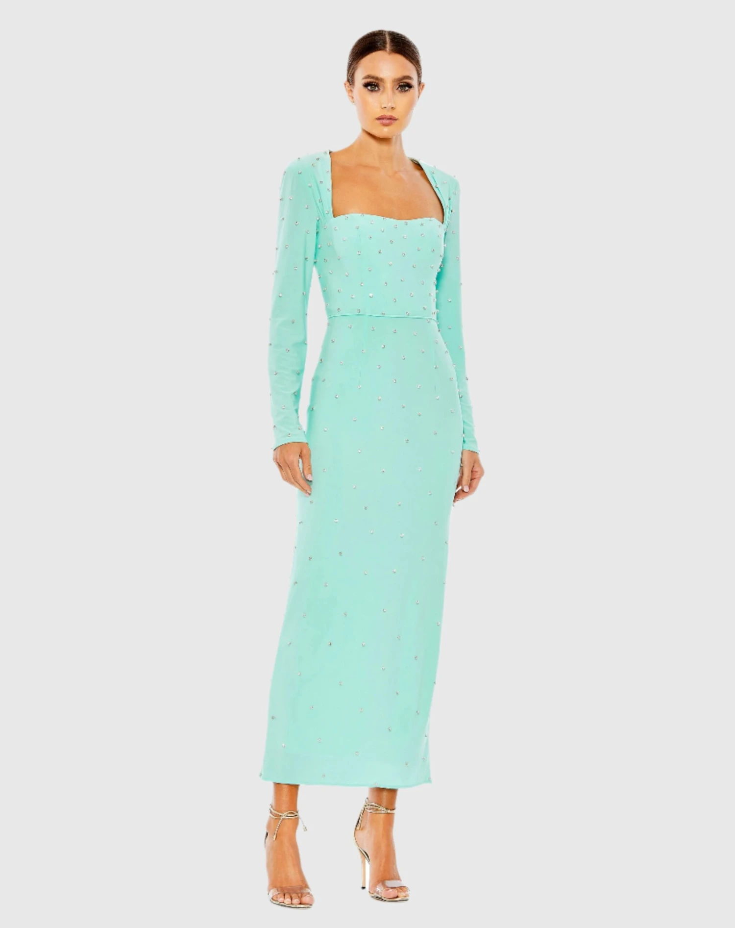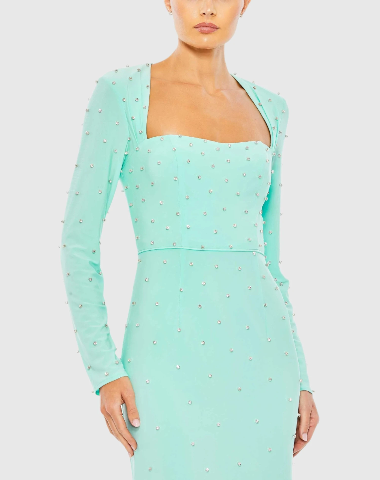 This sultry sheath is cut in a modest ankle-length, long-sleeve silhouette and detailed with luxe rhinestones that add beautiful sparkle to the piece. A deep square neckline and padded shoulders command attention, while a cutout back lends a fashion-forward finish.