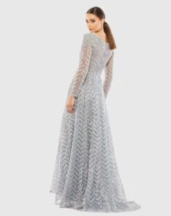 For fashion lovers seeking something sweet, chic, and whimsical, there’s this dreamy dress. The Mac Duggal gown is crafted of lightweight netting and embellished with 3-D petals, sequin fans, and a spray of silver beads. You’ll adore everything part of it—from the delicate straps to the petticoat-inspired high-low hem to the corset-laced back.