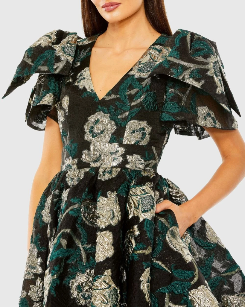 Bow Shoulders Brocade V-Neck Mini Dress With Pockets