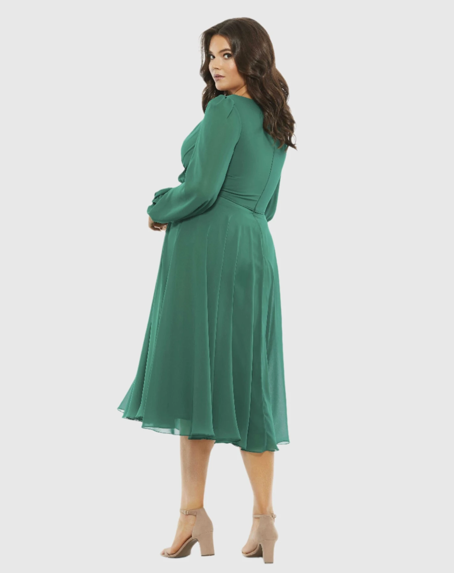The perfect all-occasion dress, this striking style is softly tailored in diaphanous chiffon. Fully lined through the body for quality and coverage, the dress features sheer bishop sleeves with puff shoulders and elasticized cuffs. A deep V-neckline, bodice pleats, and a ready-to-twirl skirt carve out a feminine, flattering shape finished with just the right amount of detail.