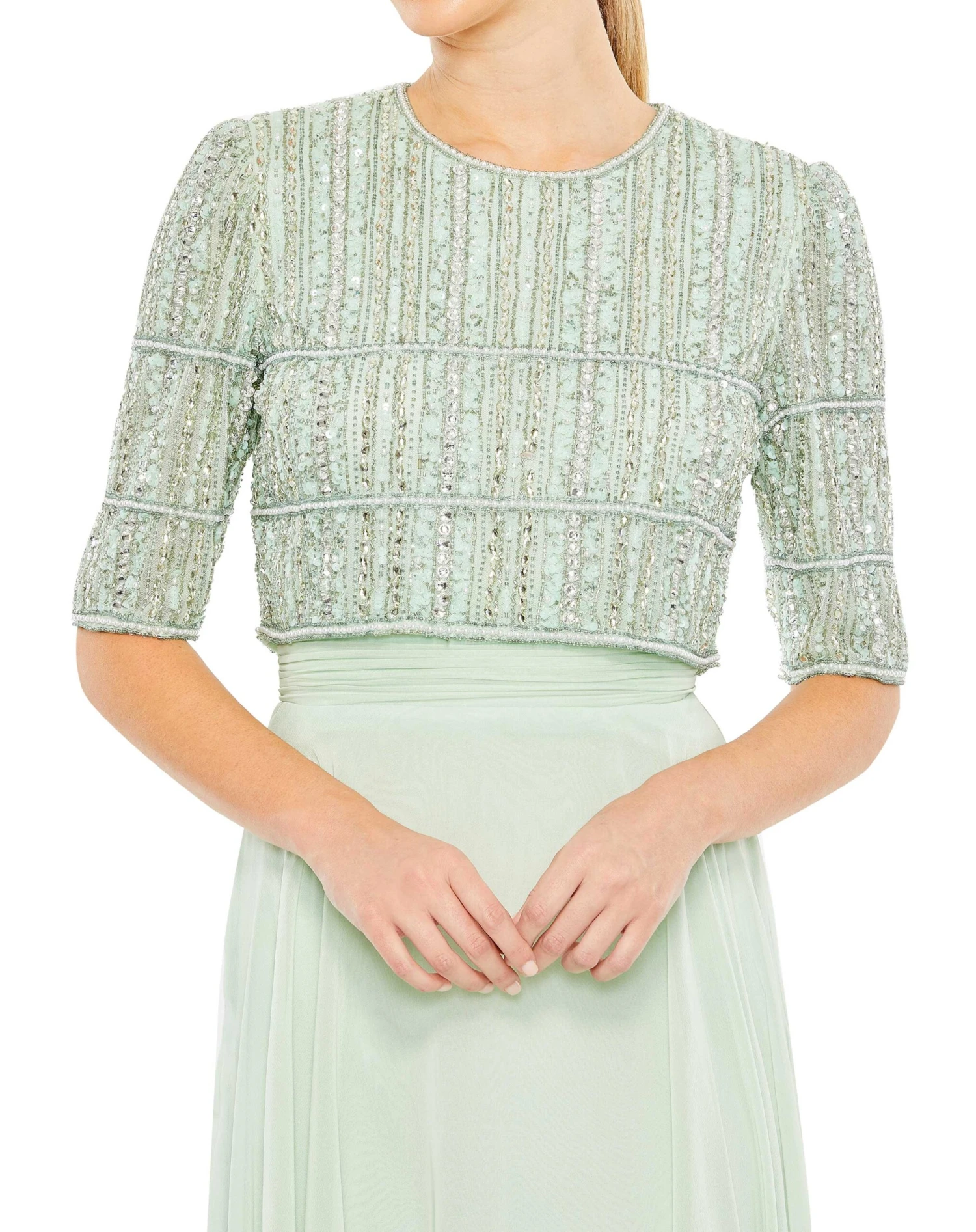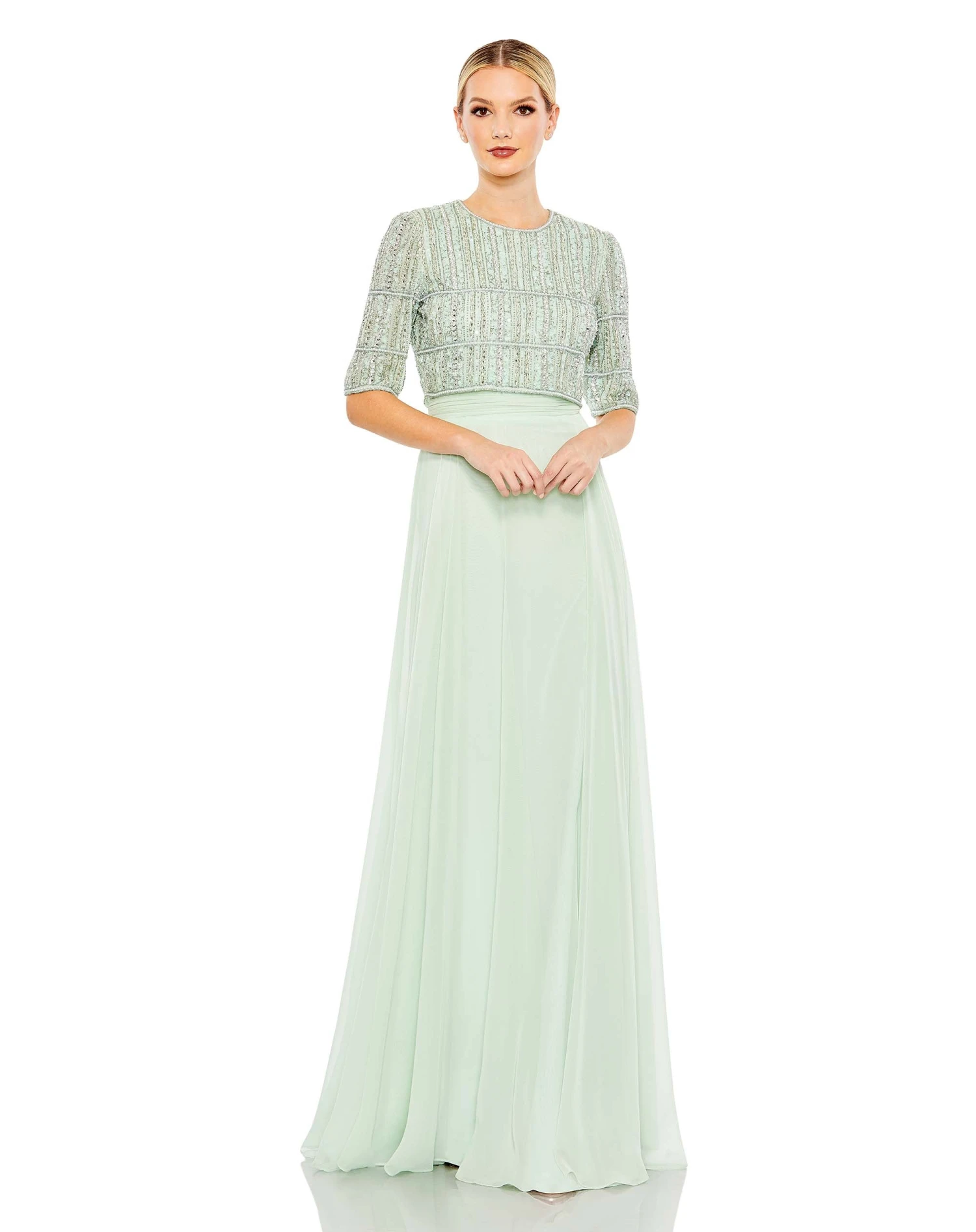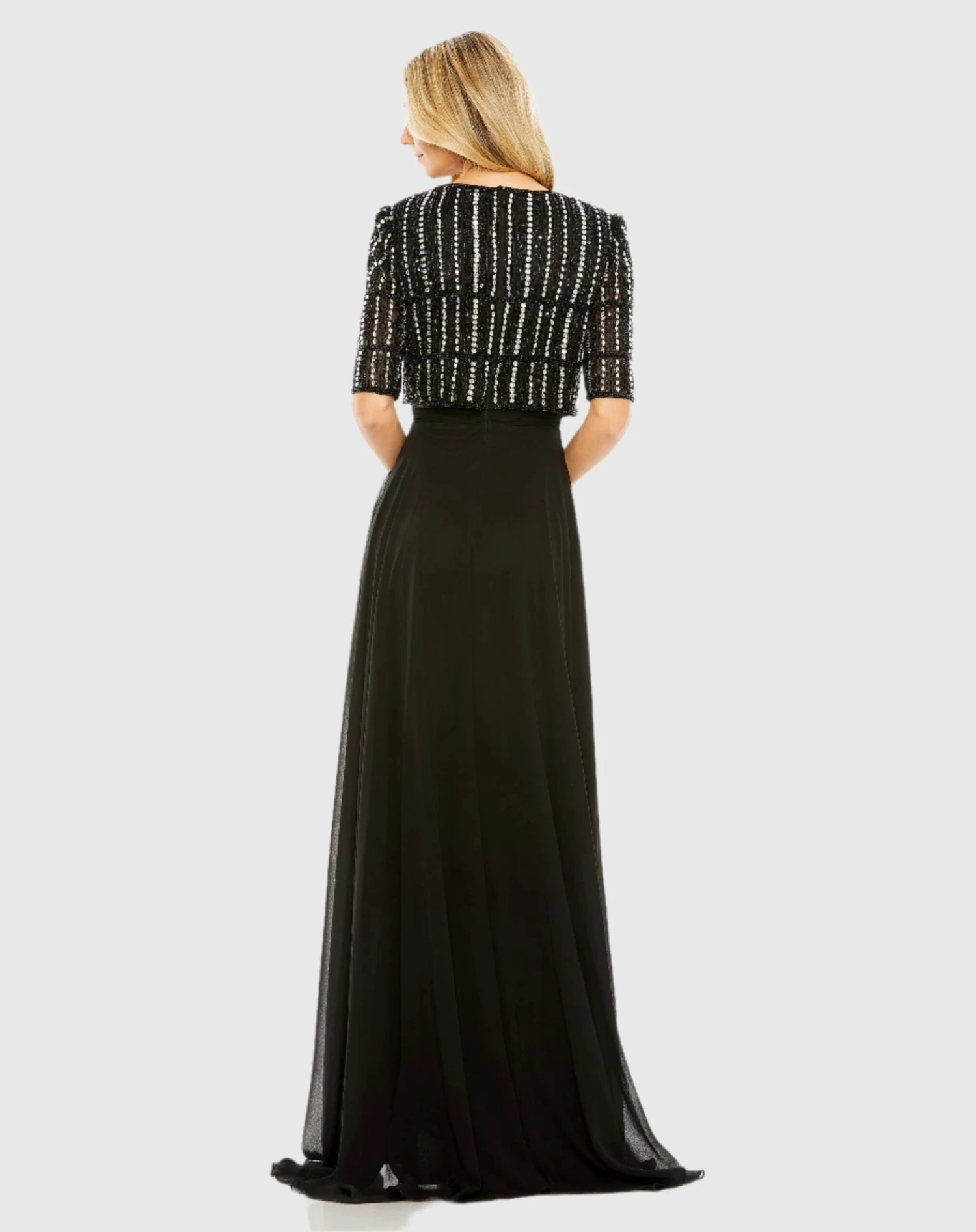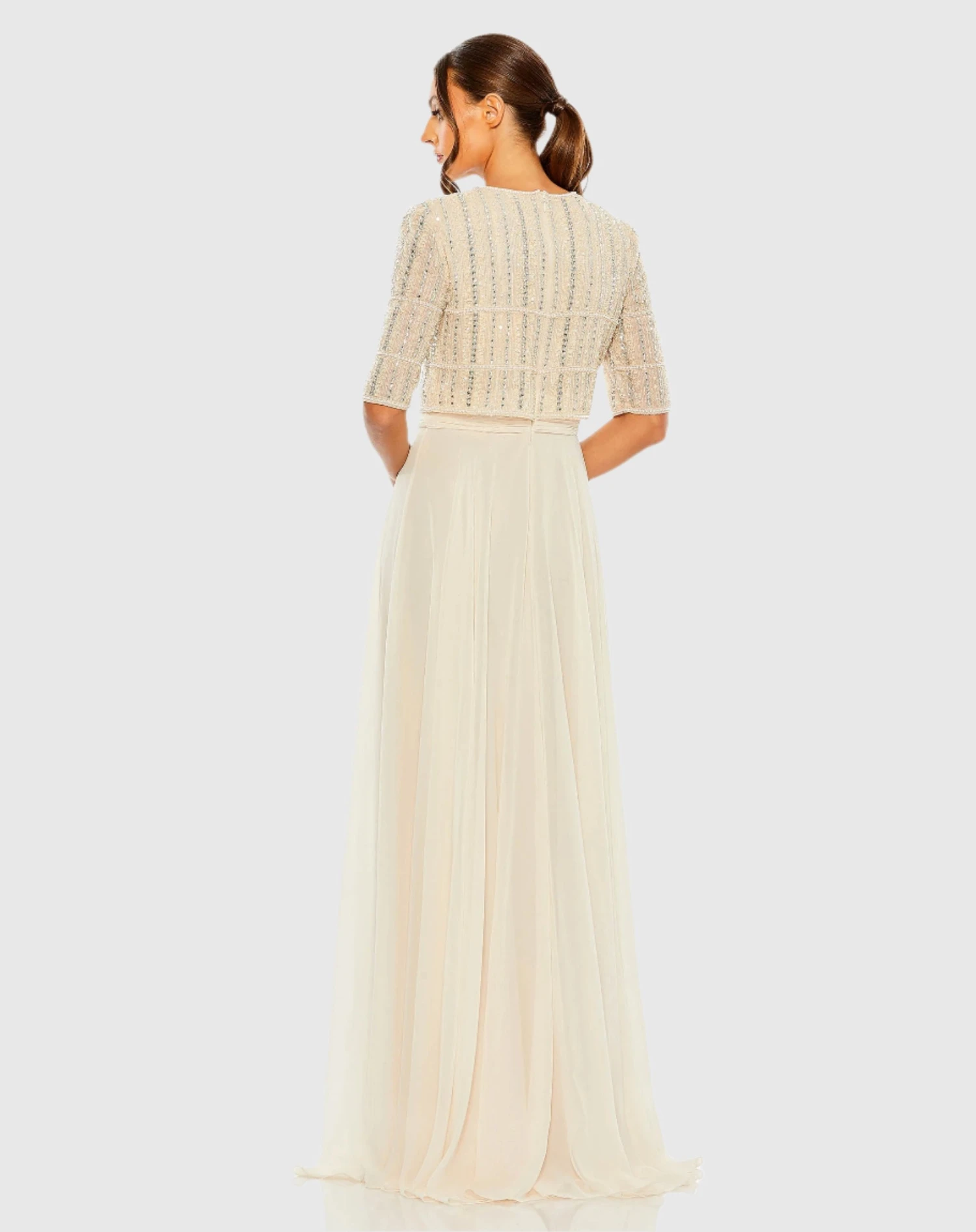 Chiffon Gown W/ Fully Beaded 1/4 Sleeve Top
