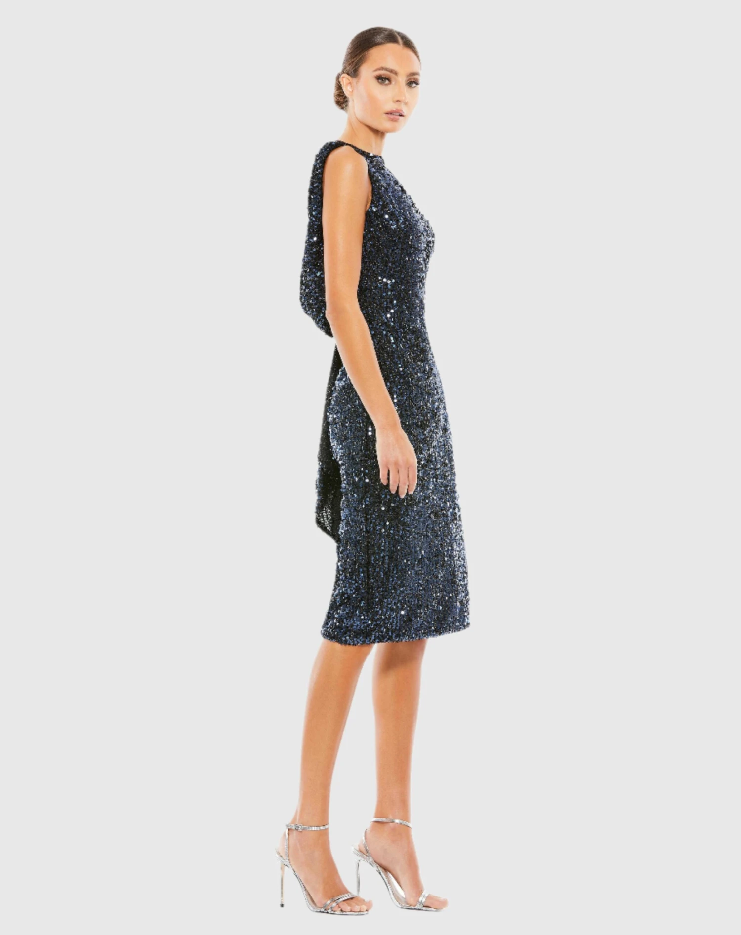 Elegant stretch sequin cocktail dress with a plunging draped back and back vent slit.