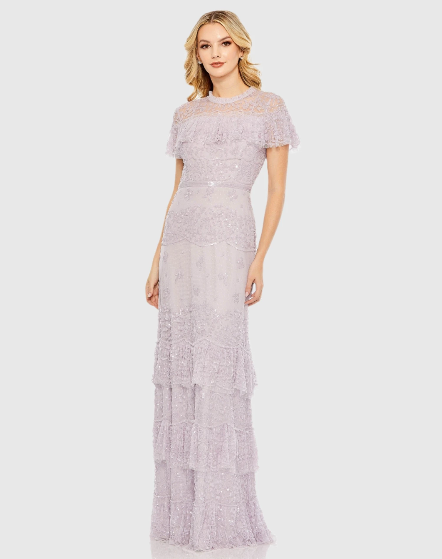 Embellished Cap Sleeve Ruffle Tiered Gown