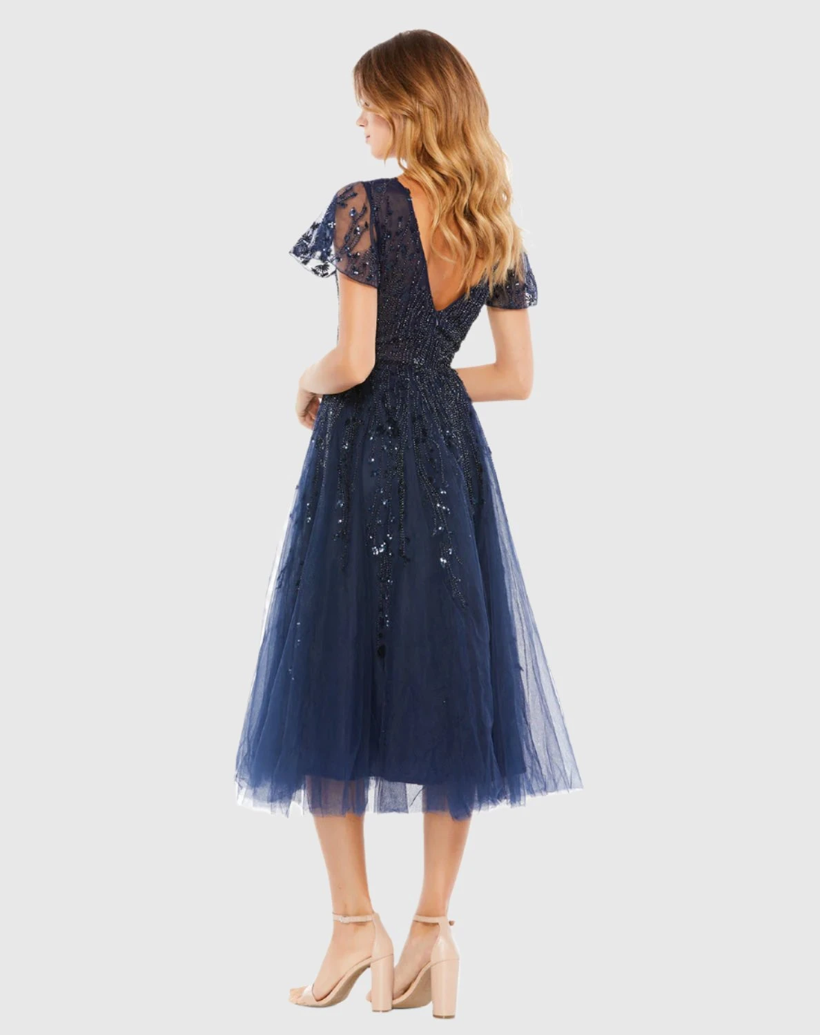Elegant tea-length dress with semi-sheer short flutter sleeves and a flattering v-neck neckline. This dress has vertical beaded embellishment throughout the bodice and sleeve.