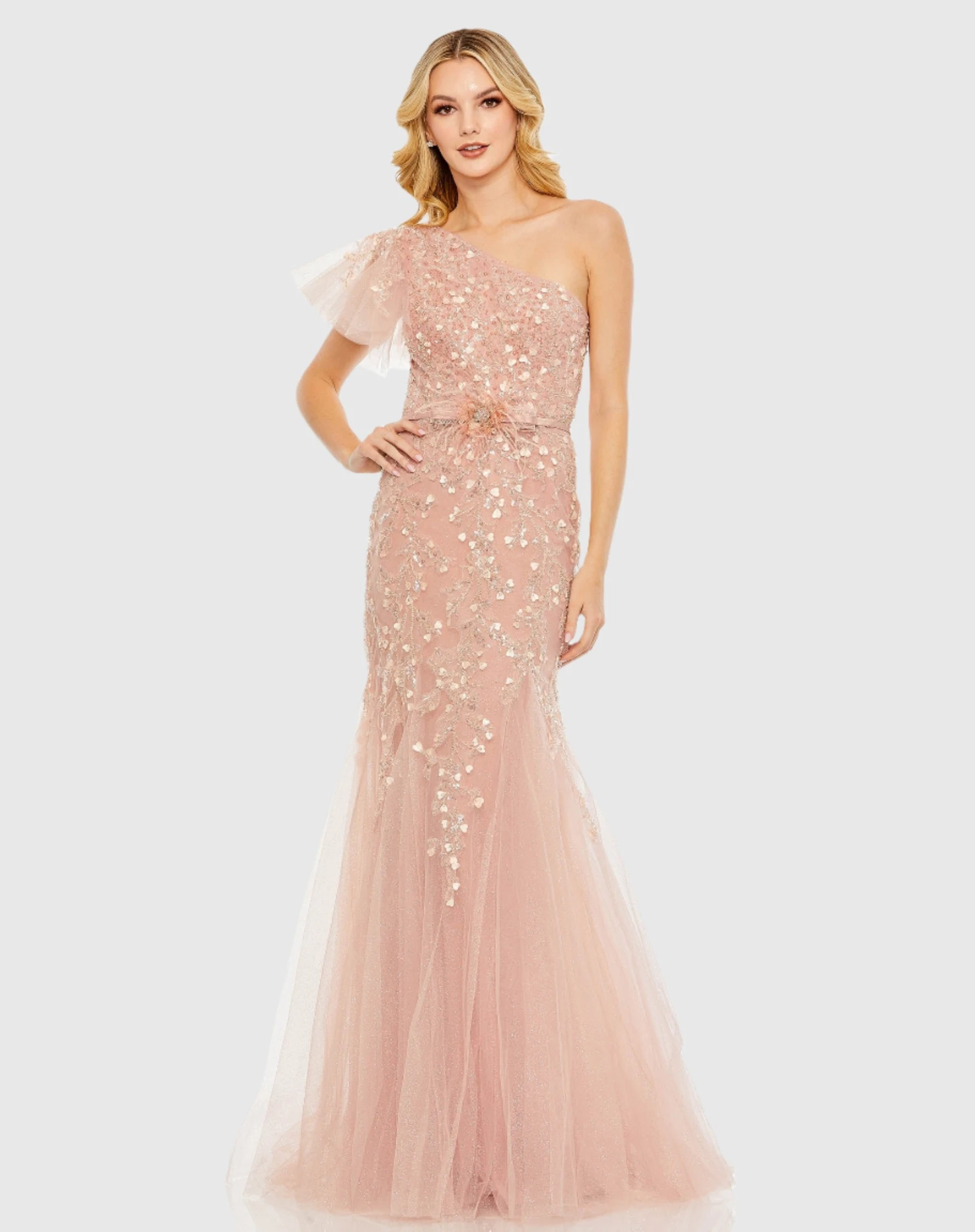 Embellished One Shoulder Cap Sleeve Gown
