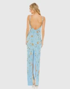 Perfect for a fresh-air affair or springtime prom, this chic gown twinkles with botanical sequin detail. Cut in a sassy, modern silhouette, the full-length dress has barely-there straps, a curved neckline, and an off-center slit that shows some leg—and your awesome shoes. An adjustable corset back adds a flirty and fashionable finishing touch.