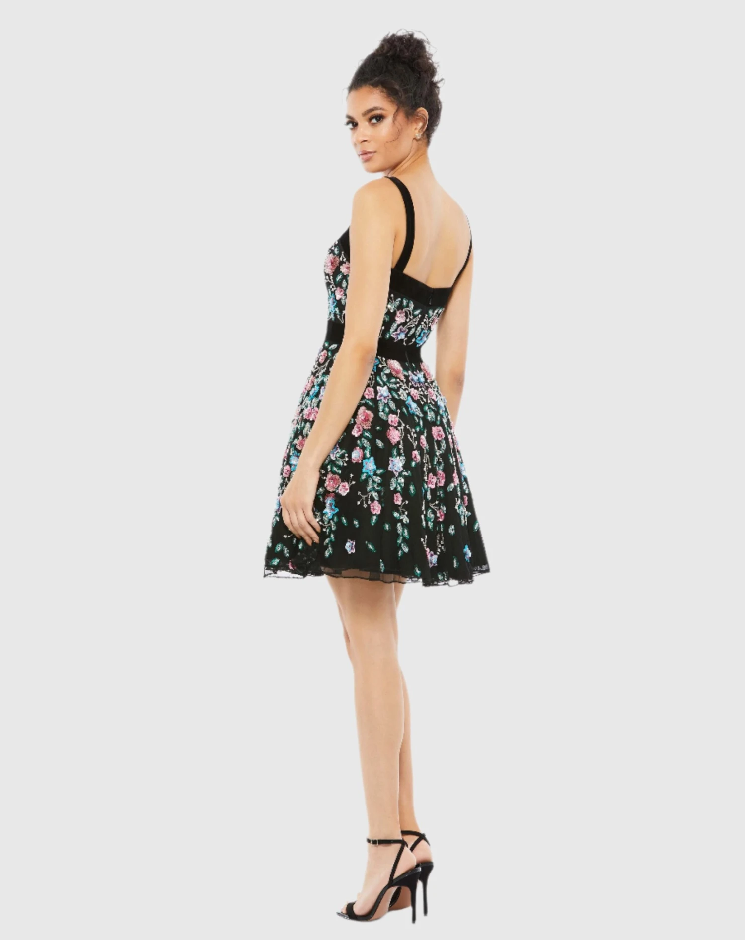 Fashioned from netting topped with romantic floral-arranged sequins and velvet trim, this dress is the perfect application of bright blooms during a cold spell. Pretty and charming, the sleeveless dress is a great short-hemline option for semi-formals and parties.