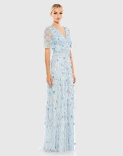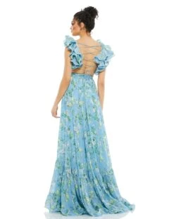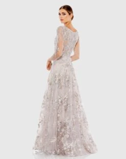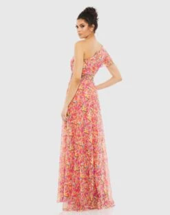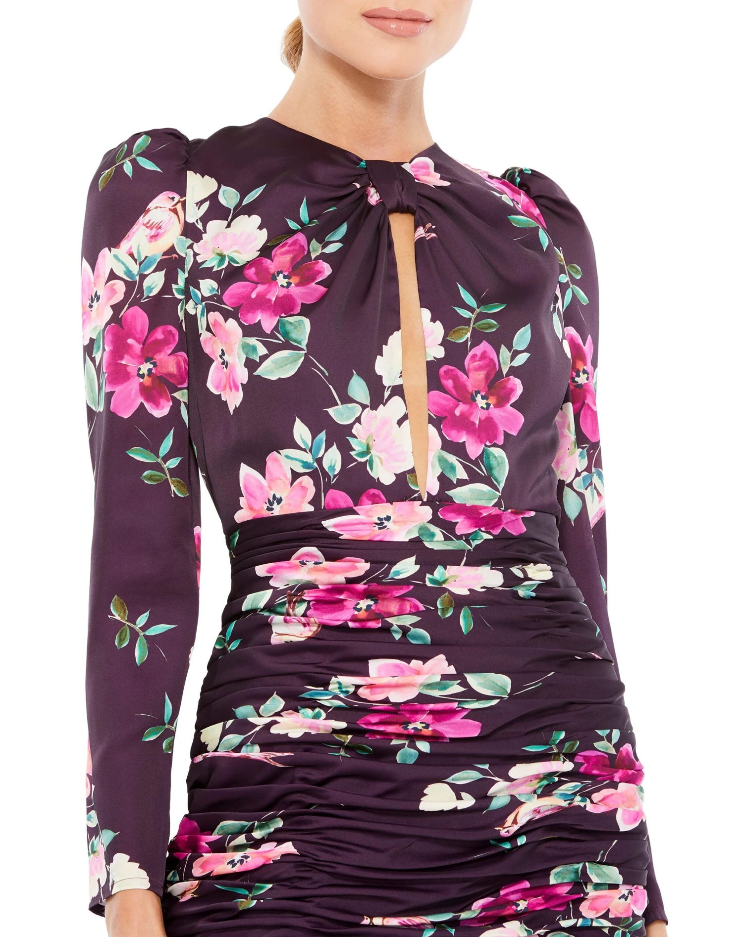 Satin plum floral mini dress with long sleeves, ruching, and a plunging keyhole cutout.