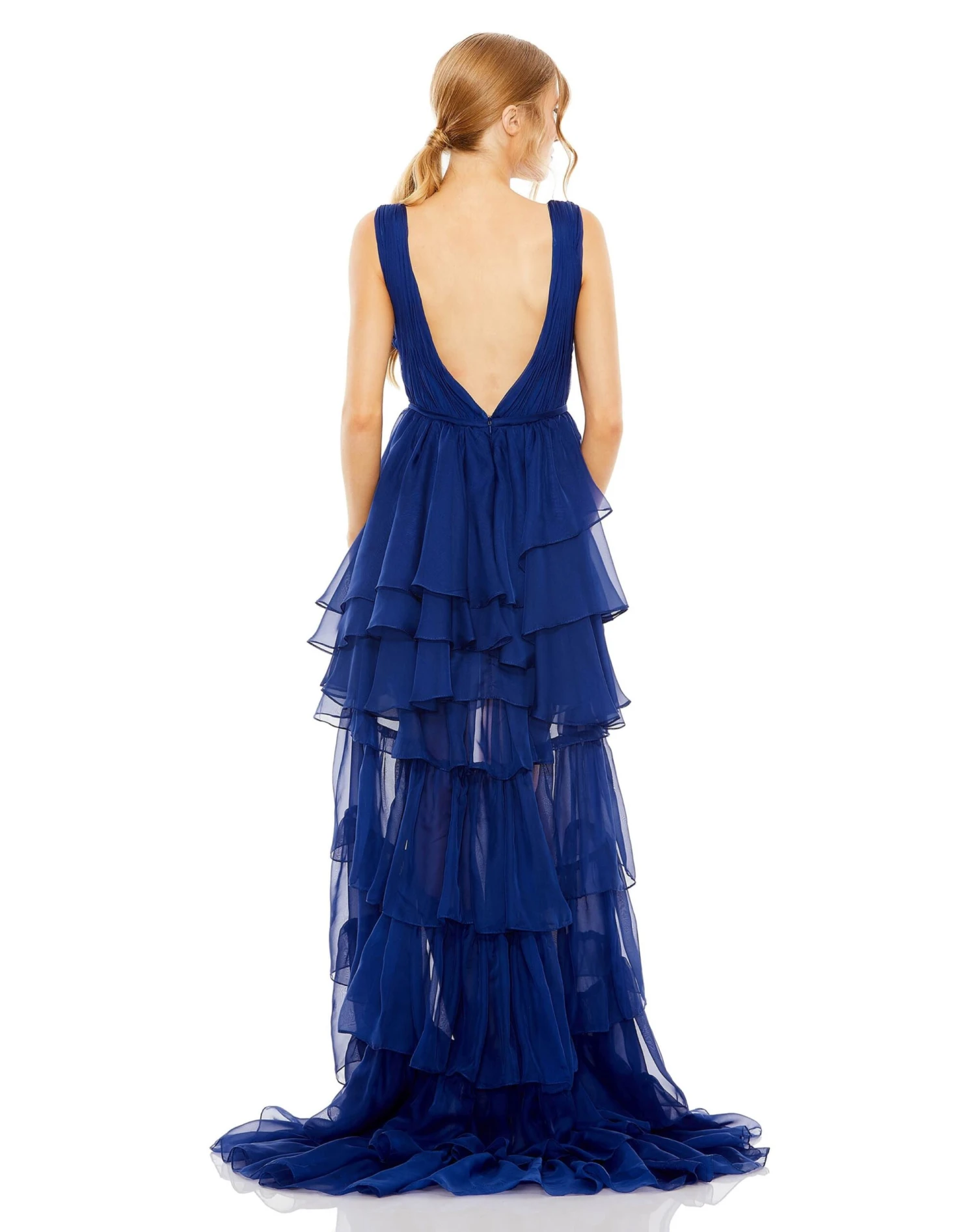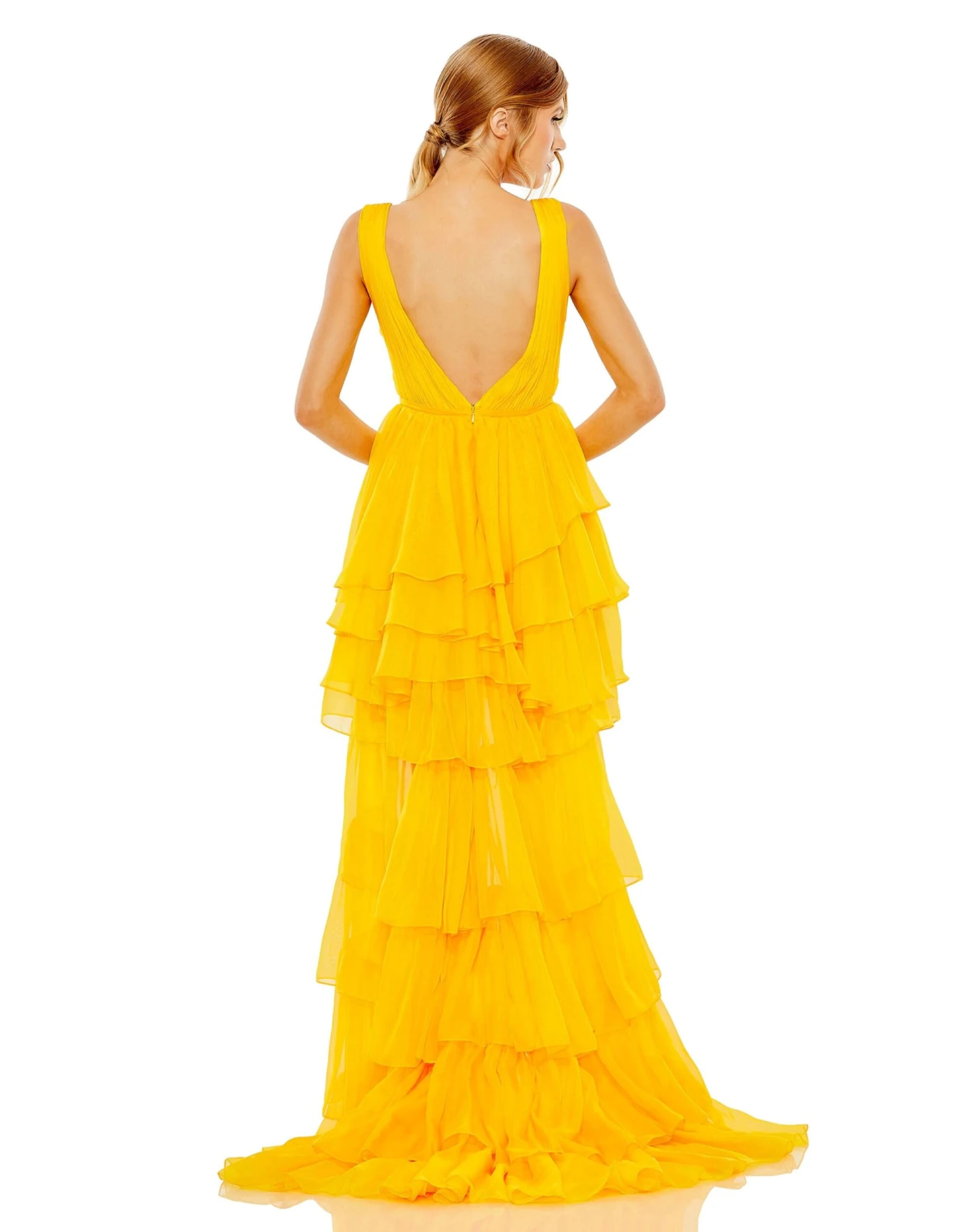 Gorgeous chiffon ruffled high low gown with built-in bodysuit.Â
