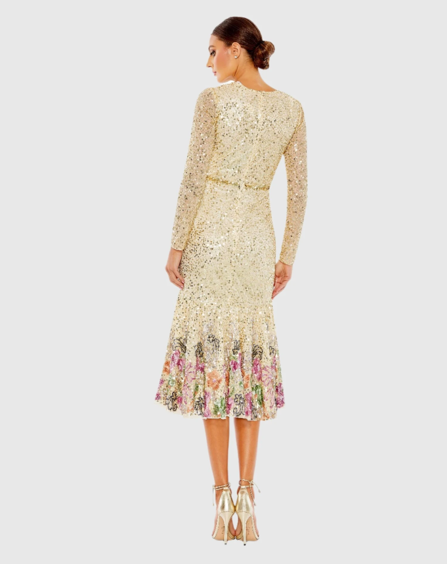 Long Sleeve Faux Wrap Embellished Tea Length Dress