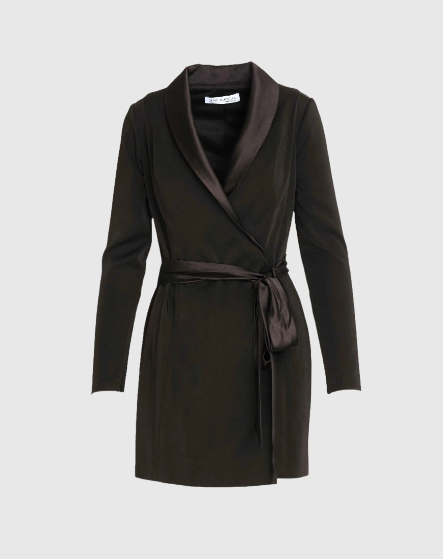 We’re in love with this tuxedo-inspired wrap dress that’s perfect for parties, holidays, and girls’ night out. The dress is cut well above the knee to showcase your gams and is styled with a satin shawl lapel and bow belt. Wear yours with glittery tights or bare legs and ankle-strap sandals.