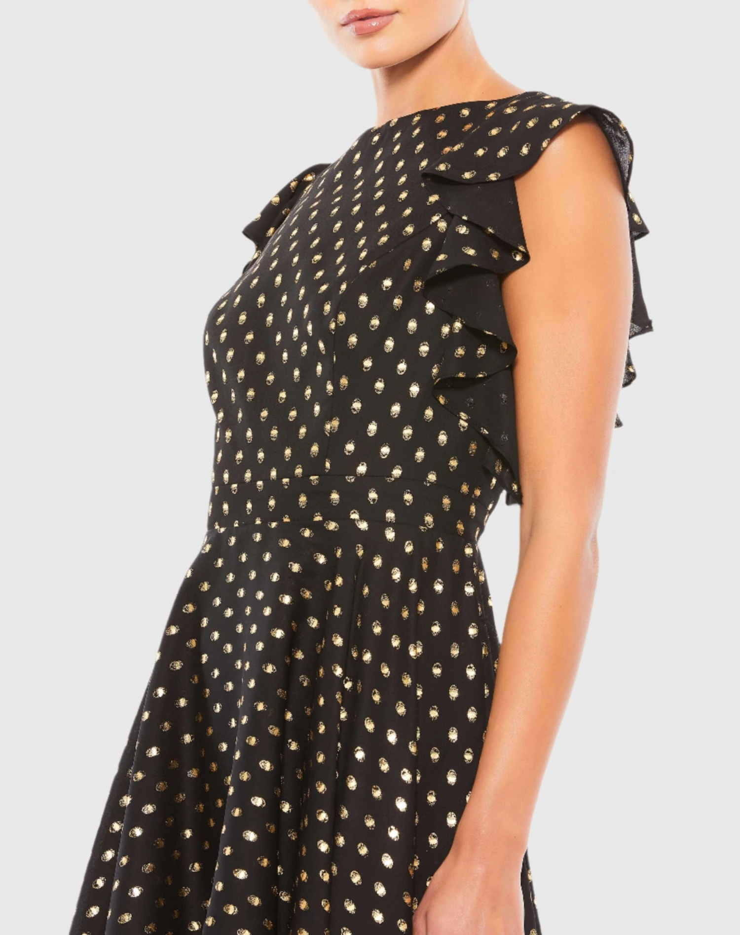 Cute black-and-gold polkadot printed mini dress with a layered skirt and flutter sleeves.
