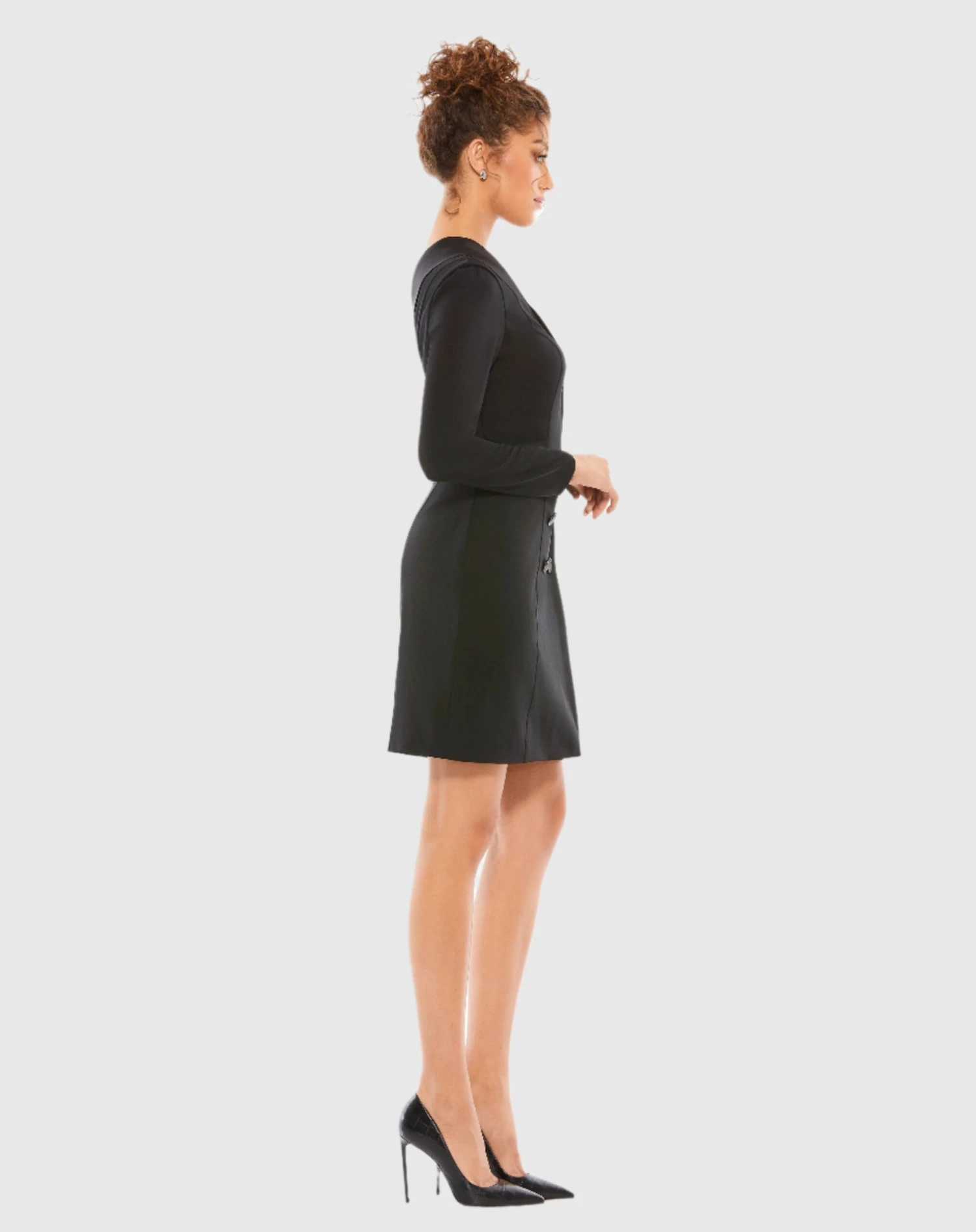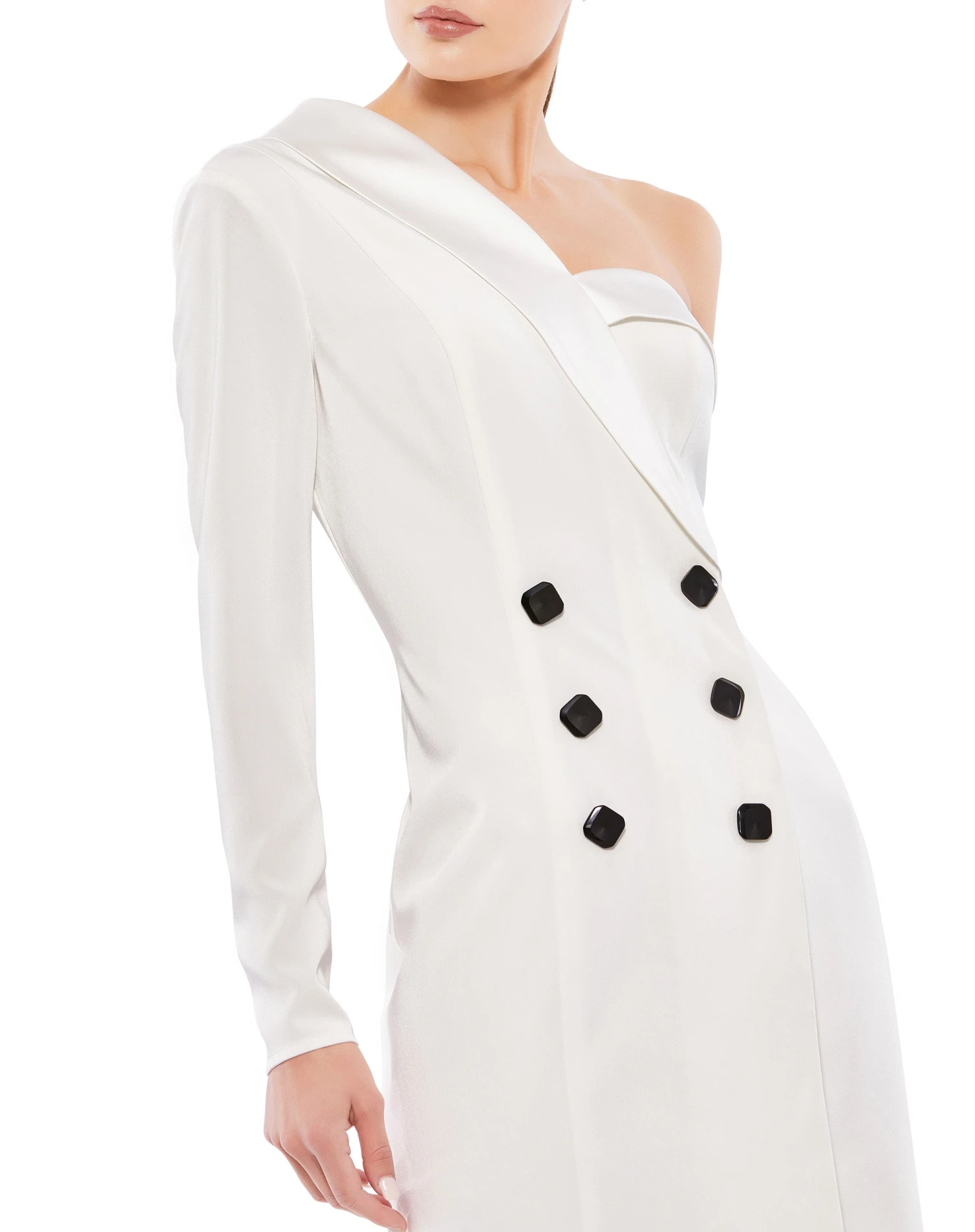 One-shoulder tailored tuxedo cocktail dress with an asymmetrical satin lapel and black faceted buttons.
