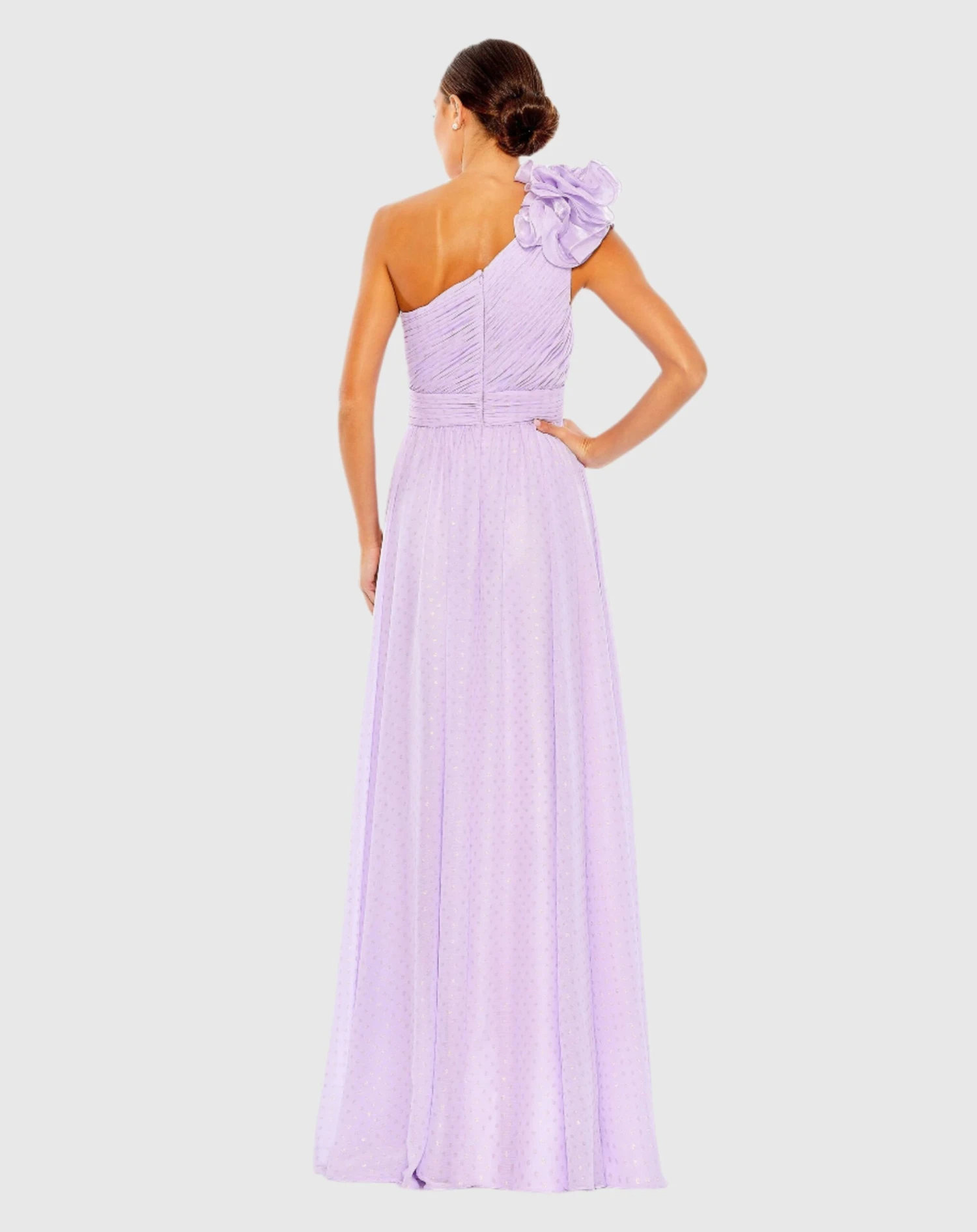 Metallic polka dots add a festive touch to this party-ready dress. Made in fluid chiffon, the one-shoulder dress is styled with a mixed-material rosette accent. The dress also features a stylish pleated bodice and flattering waist. Accessorize it with a golden clutch to highlight the gleaming dot detail. Â