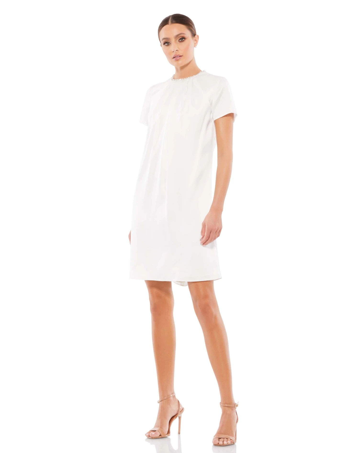 This effortless shift has easy, relaxed styling with a band of crystals around the neckline to elevate the otherwise minimalist design. The dress flaunts short sleeves, a central inverted pleat, and a rounded shirttail-inspired hem. Give it a fresh twist with high-top sneakers or style it for special occasions with classic pumps.