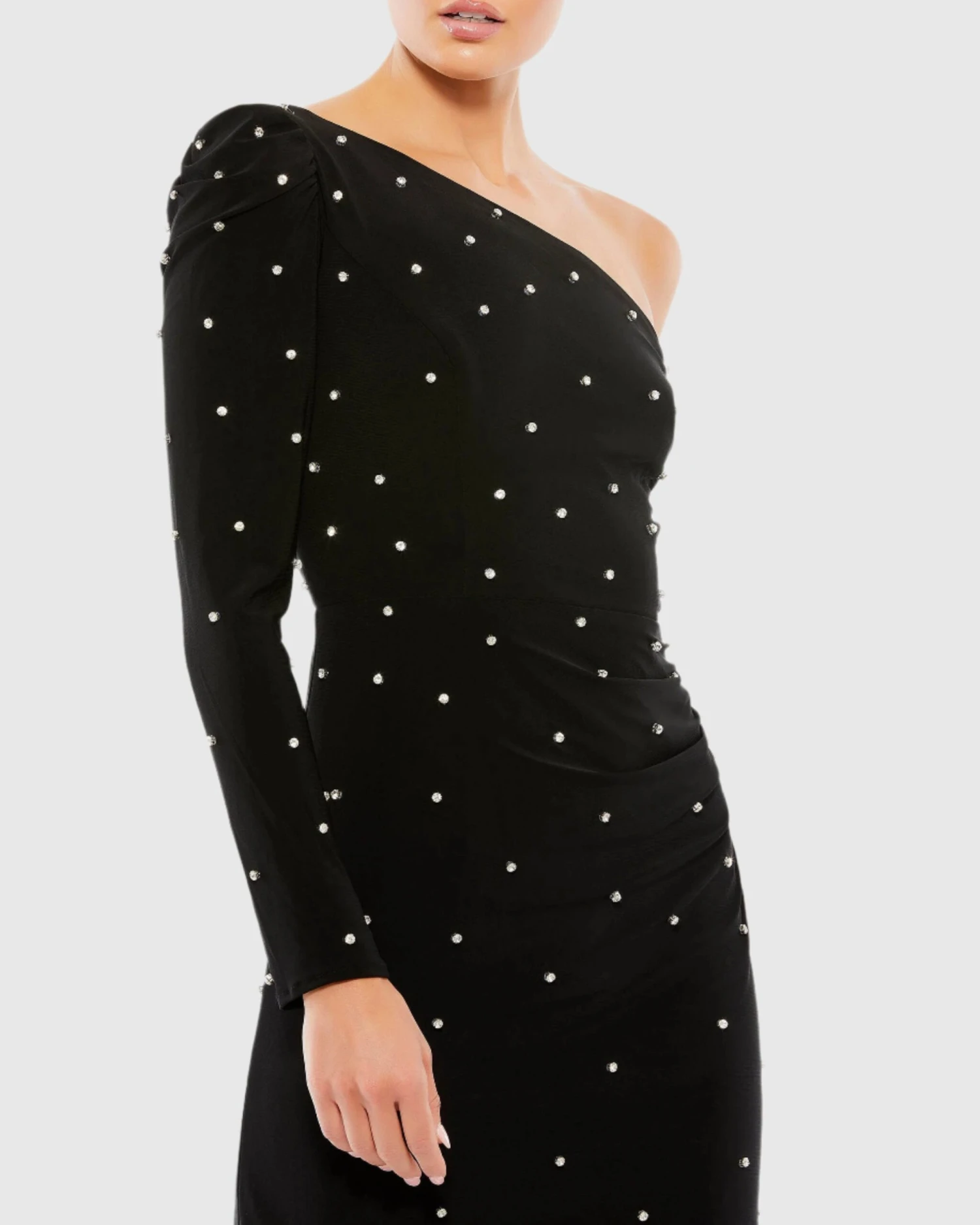 - Asymmetric one-shoulder neckline