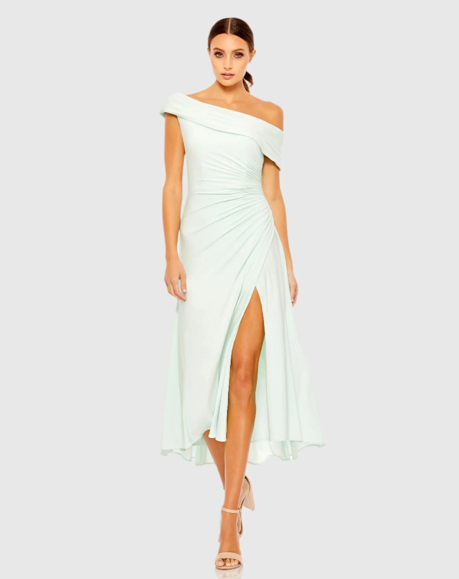 Foldover ruched off-the-shoulder jersey midi dress with an a-line skirt and thigh-high slit