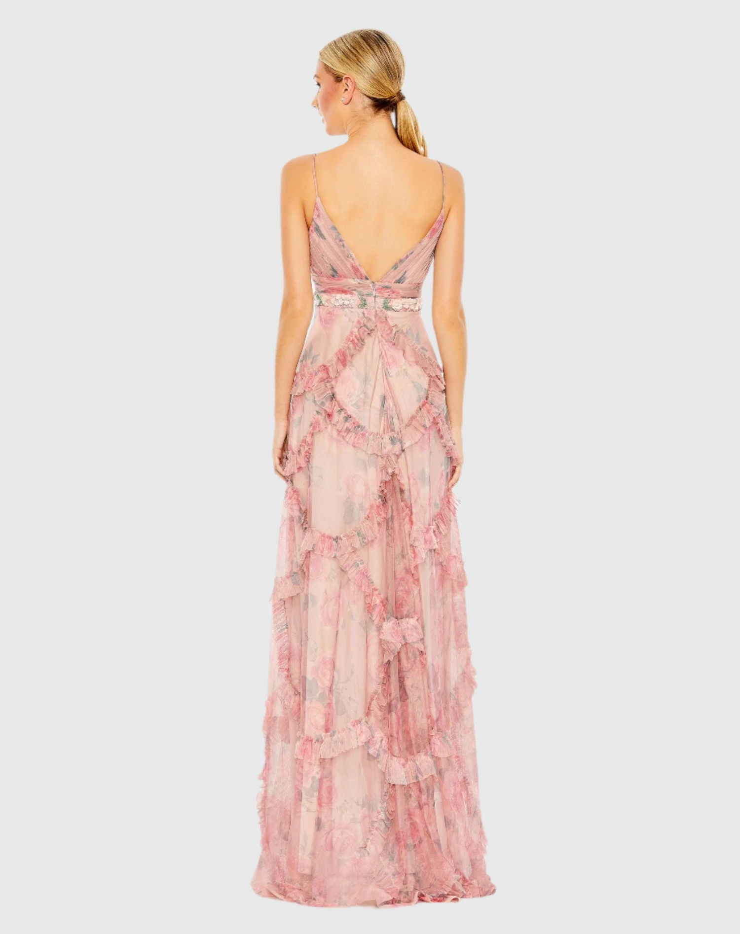 Regency era beauty meets modern glamour in this gossamer floral gown. The dress is designed in rose print with a gathered V-neck bodice, shimmering flower-detailed waistband, and maxi-length skirt with a fanfare of ruffles. Accessorize the dress with a choker and barely-there heels.