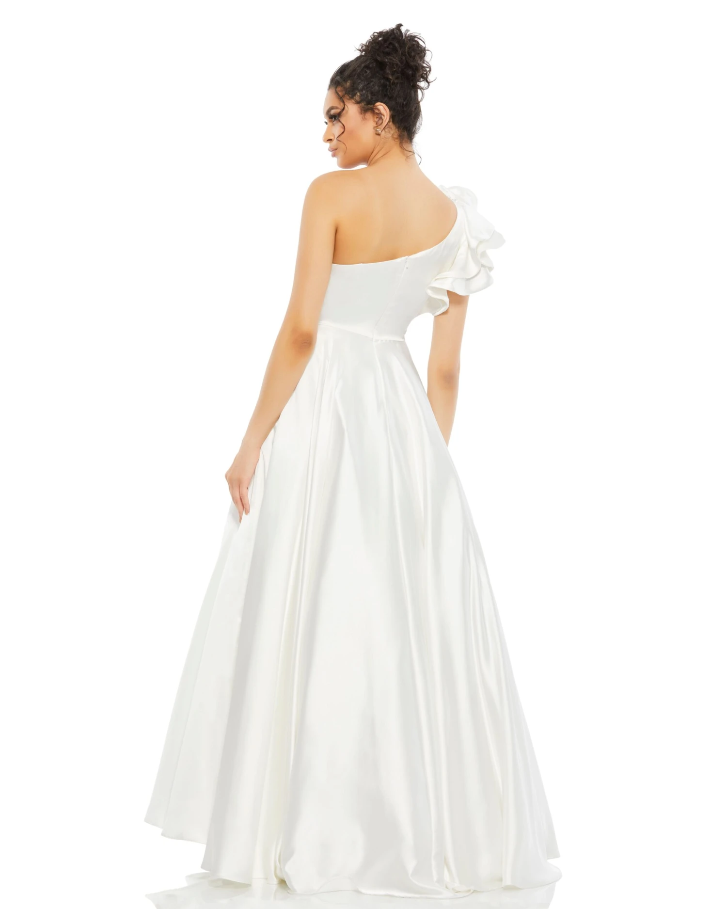 Elegant one-shoulder satin ballgown with an a-line skirt and a dramatic ruffle shoulder