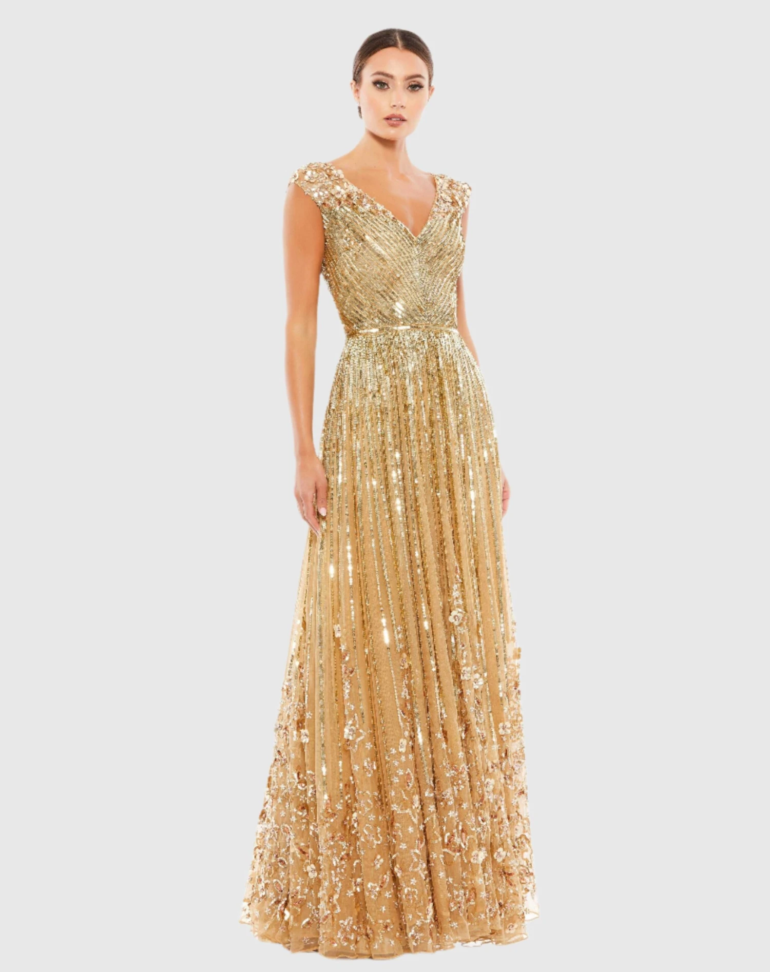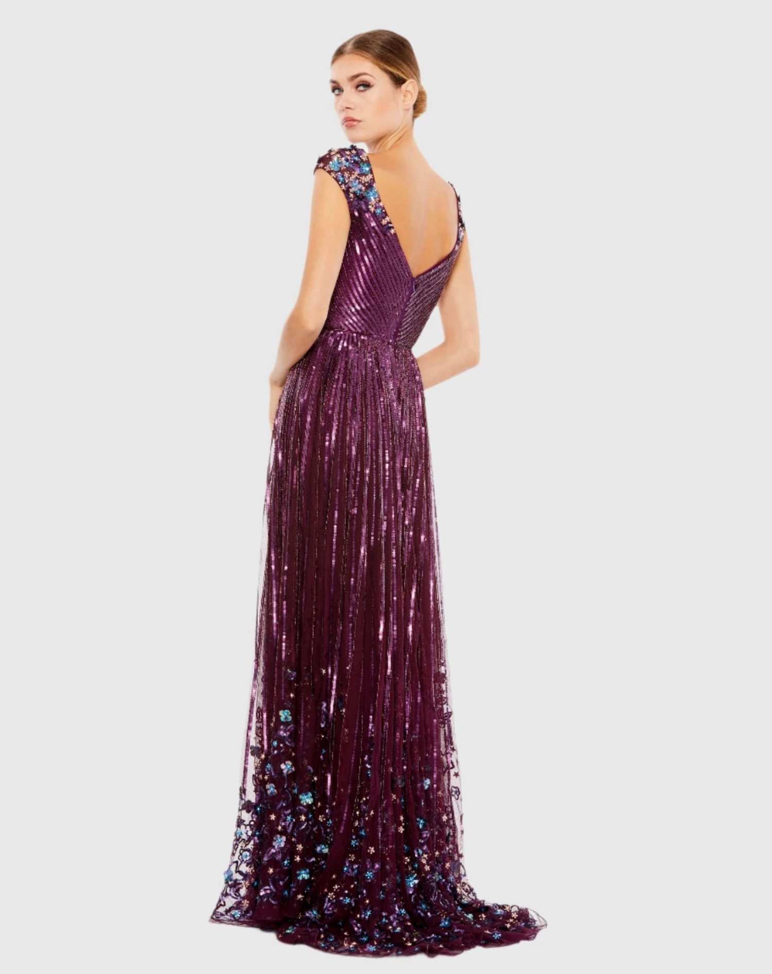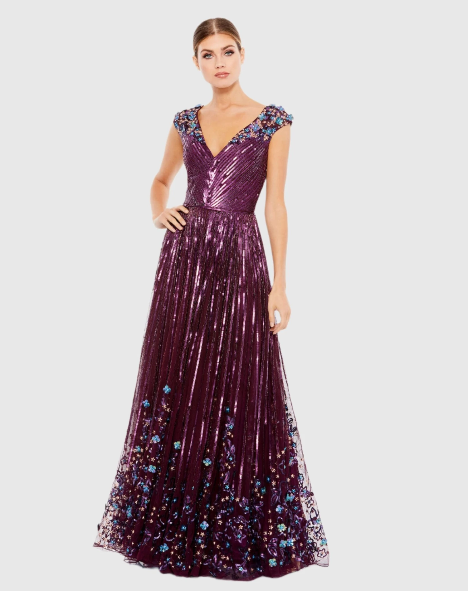 Floor-length evening gown cascading sequin stripes, exquisite 3D floral embellishments at the shoulders and bottom hem, and a sweeping A-line hem.