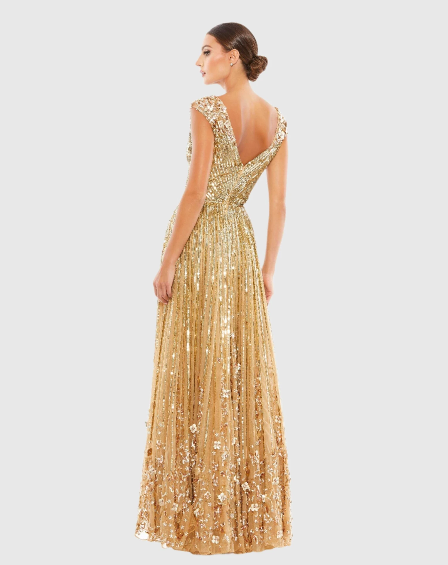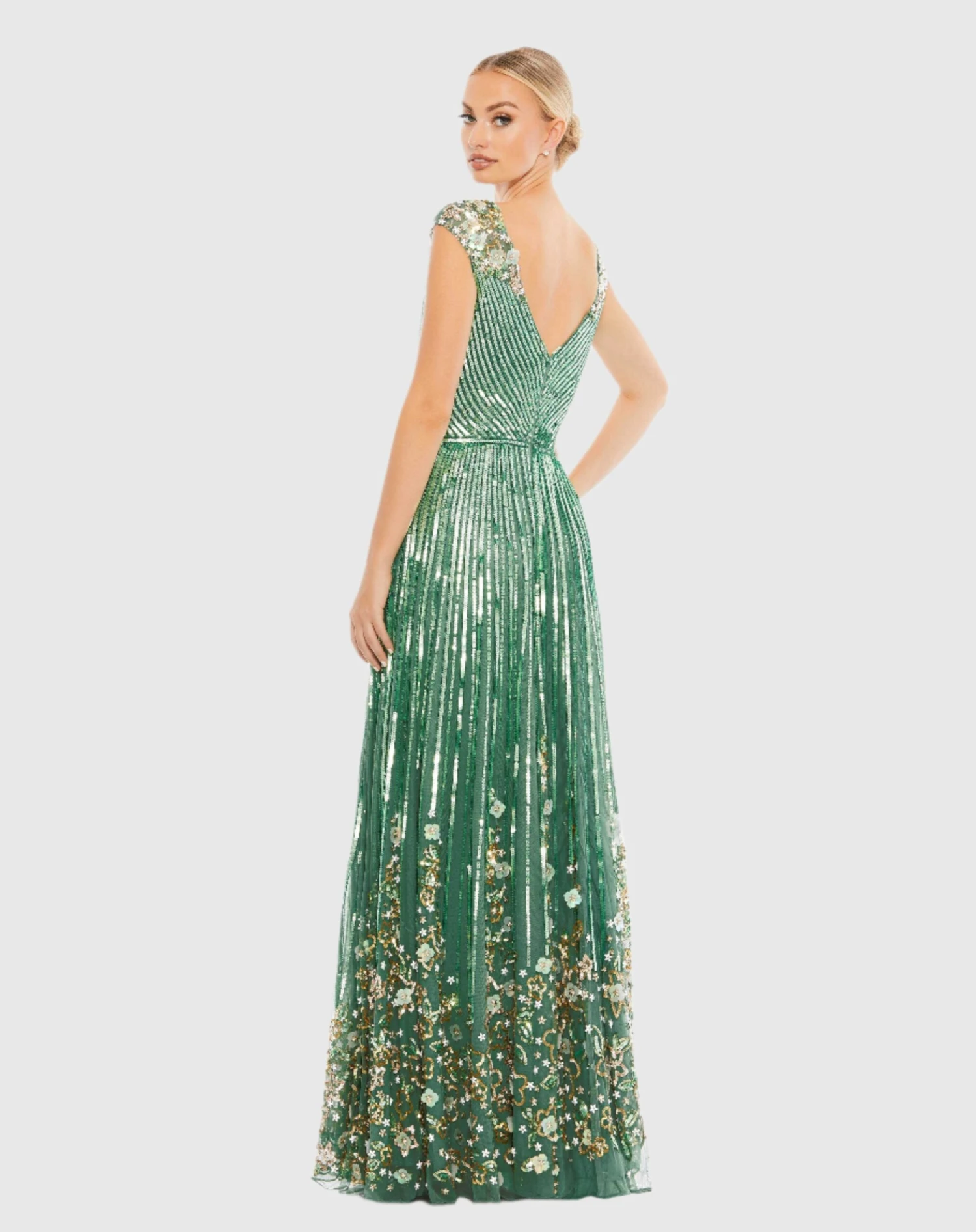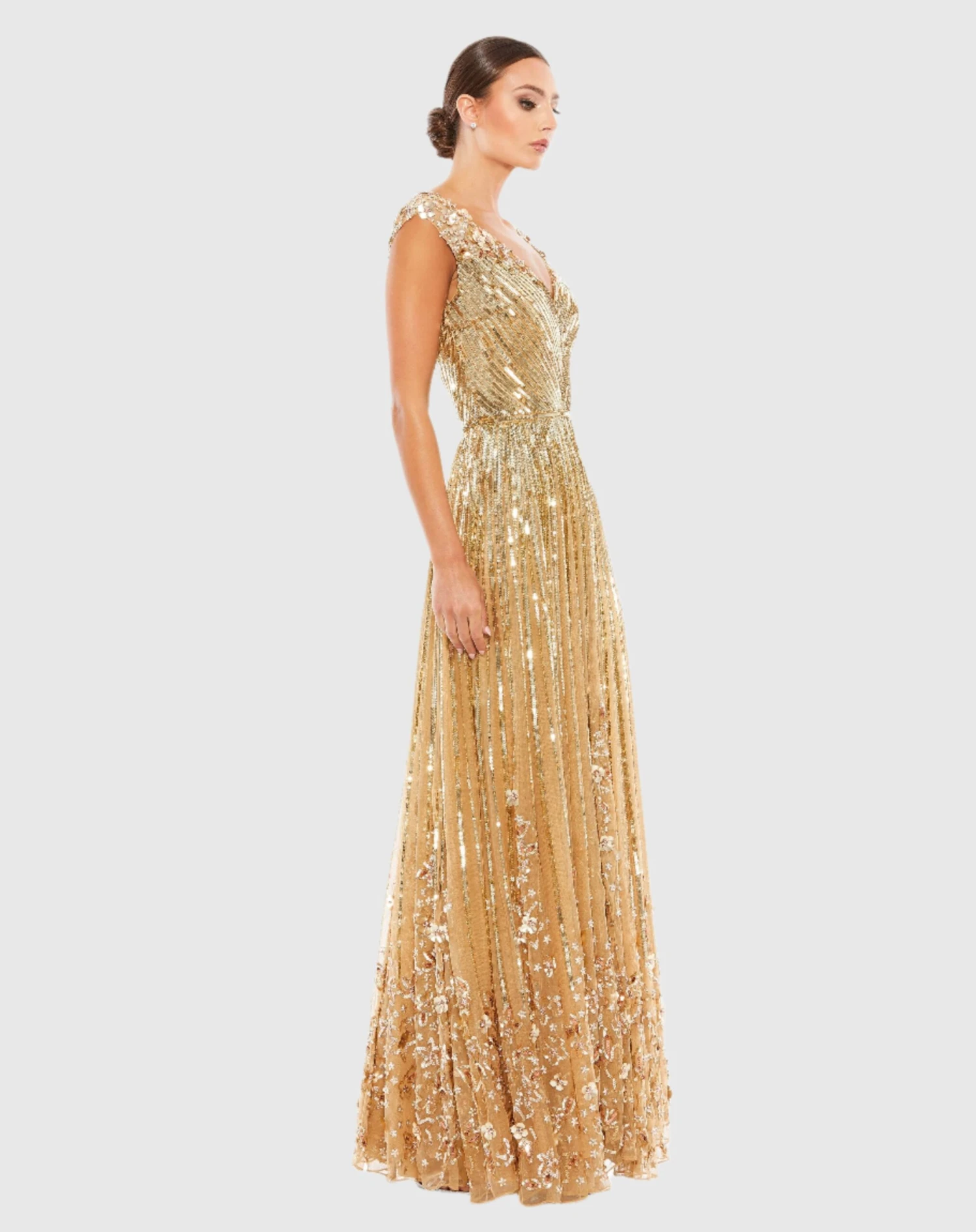 Floor-length evening gown cascading sequin stripes, exquisite 3D floral embellishments at the shoulders and bottom hem, and a sweeping A-line hem.