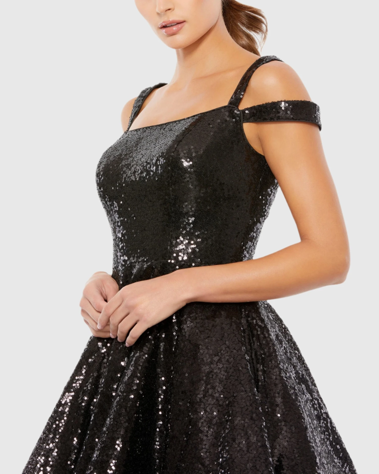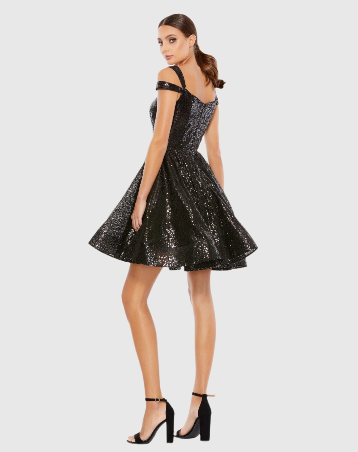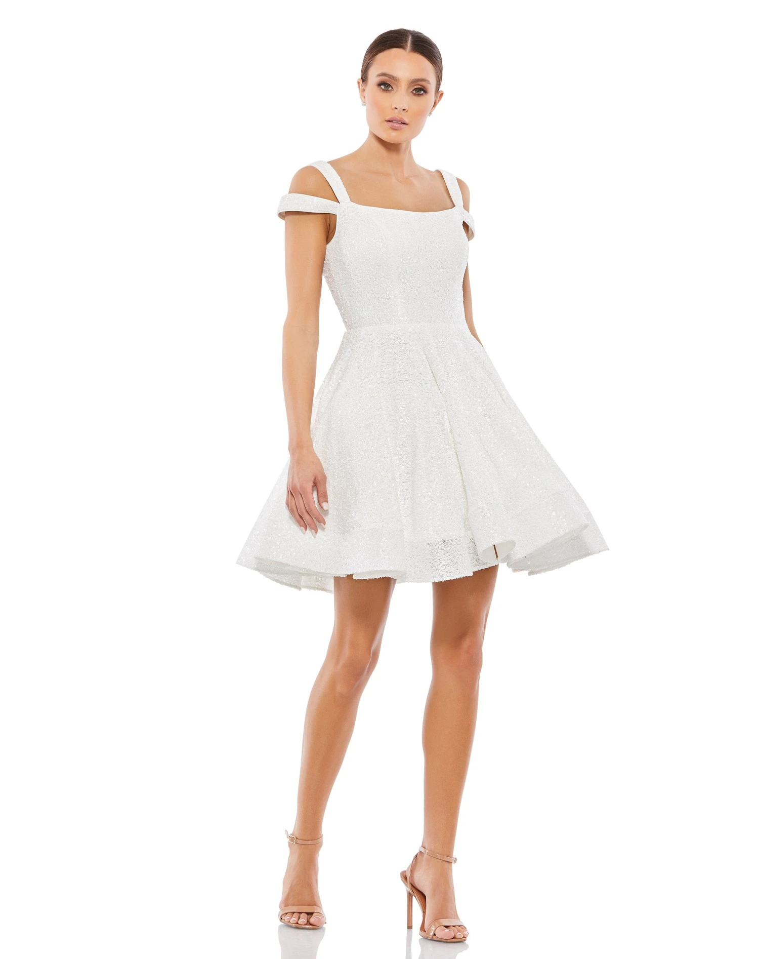 Fully sequined fit and flare skater dress with a cut out shoulder detail.