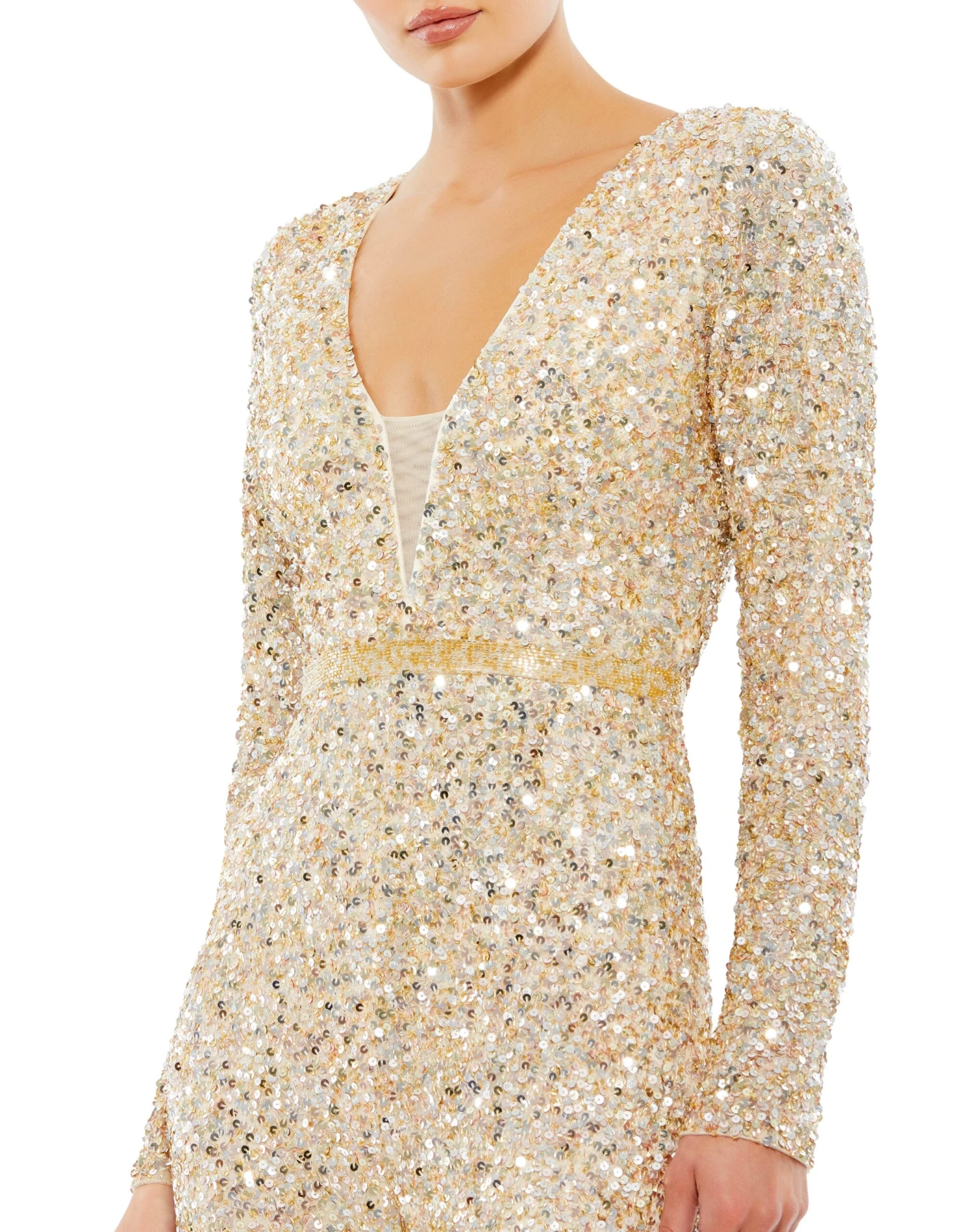 You’ll dazzle in this stunning sequin-decked jumpsuit. A bold alternative to a wedding reception dress or a fun option for NYE, the show-stopping one-piece is styled with a low neckline finished with an inset of mesh, fitted long sleeves, a beaded belt, and a gently flared leg.