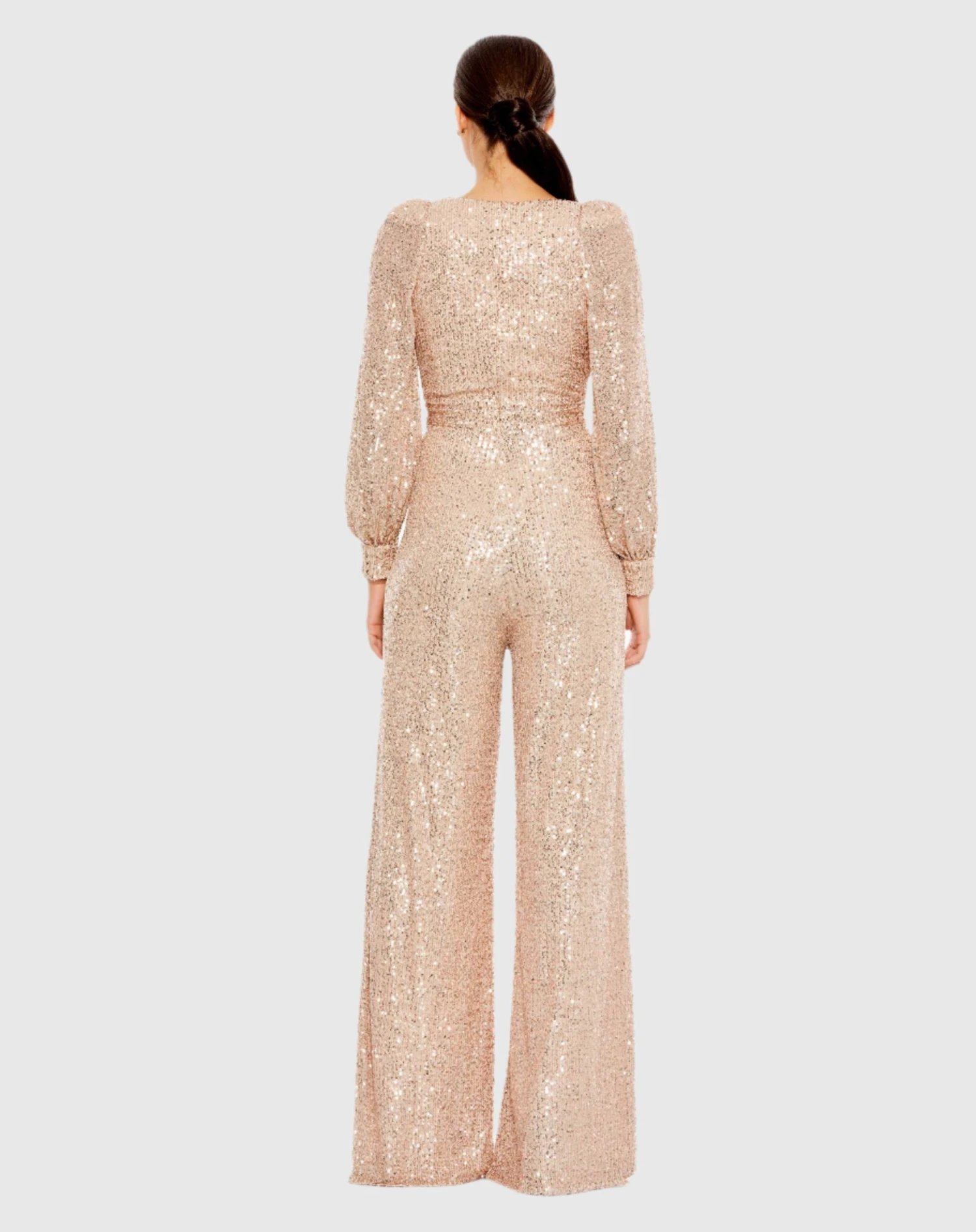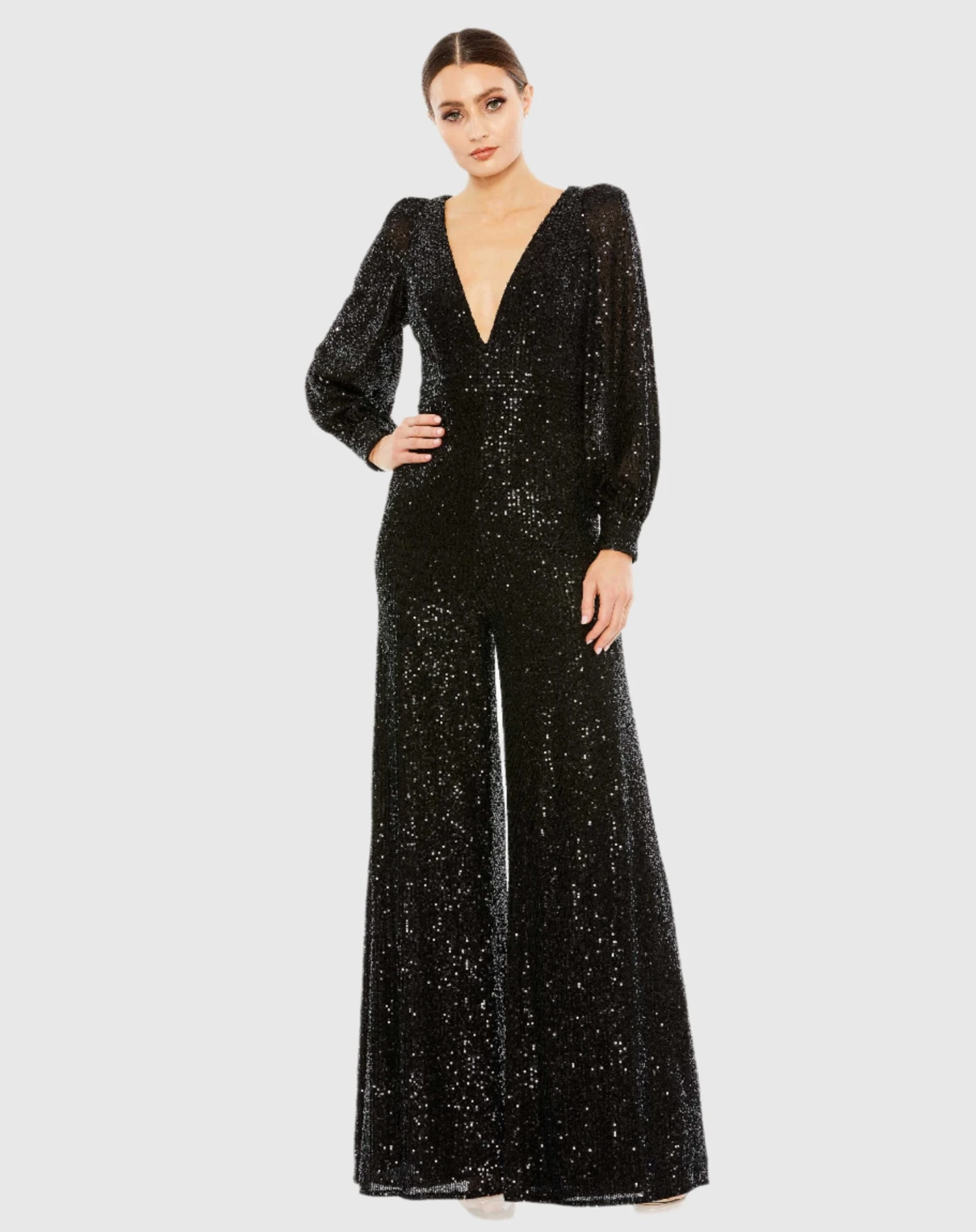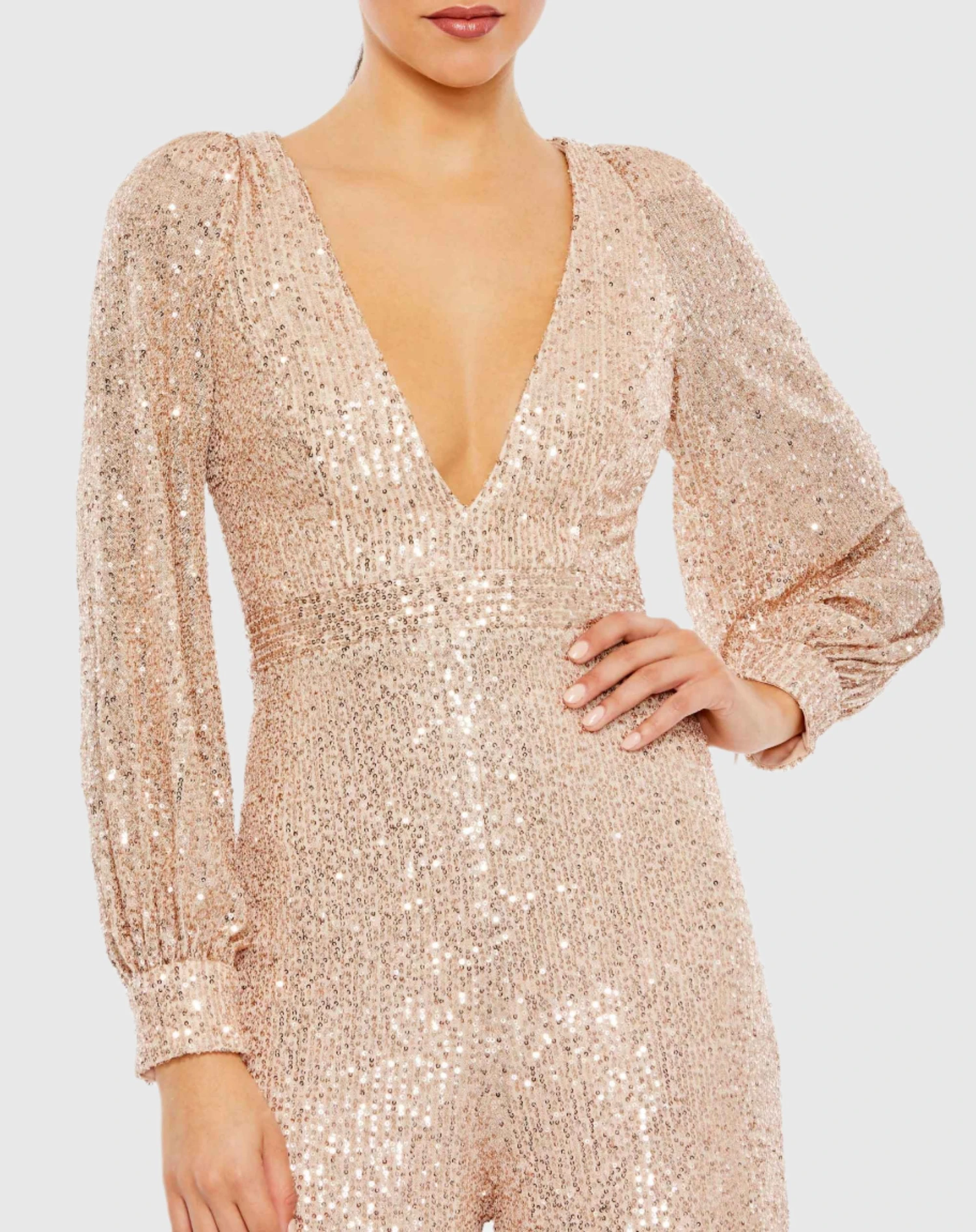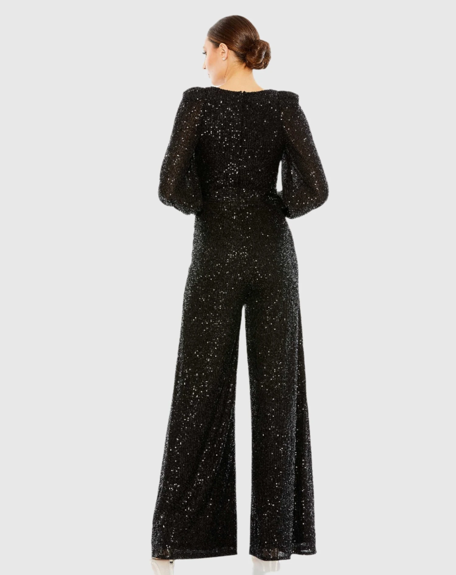 Sequined V Neck Bishop Sleeve Jumpsuit
