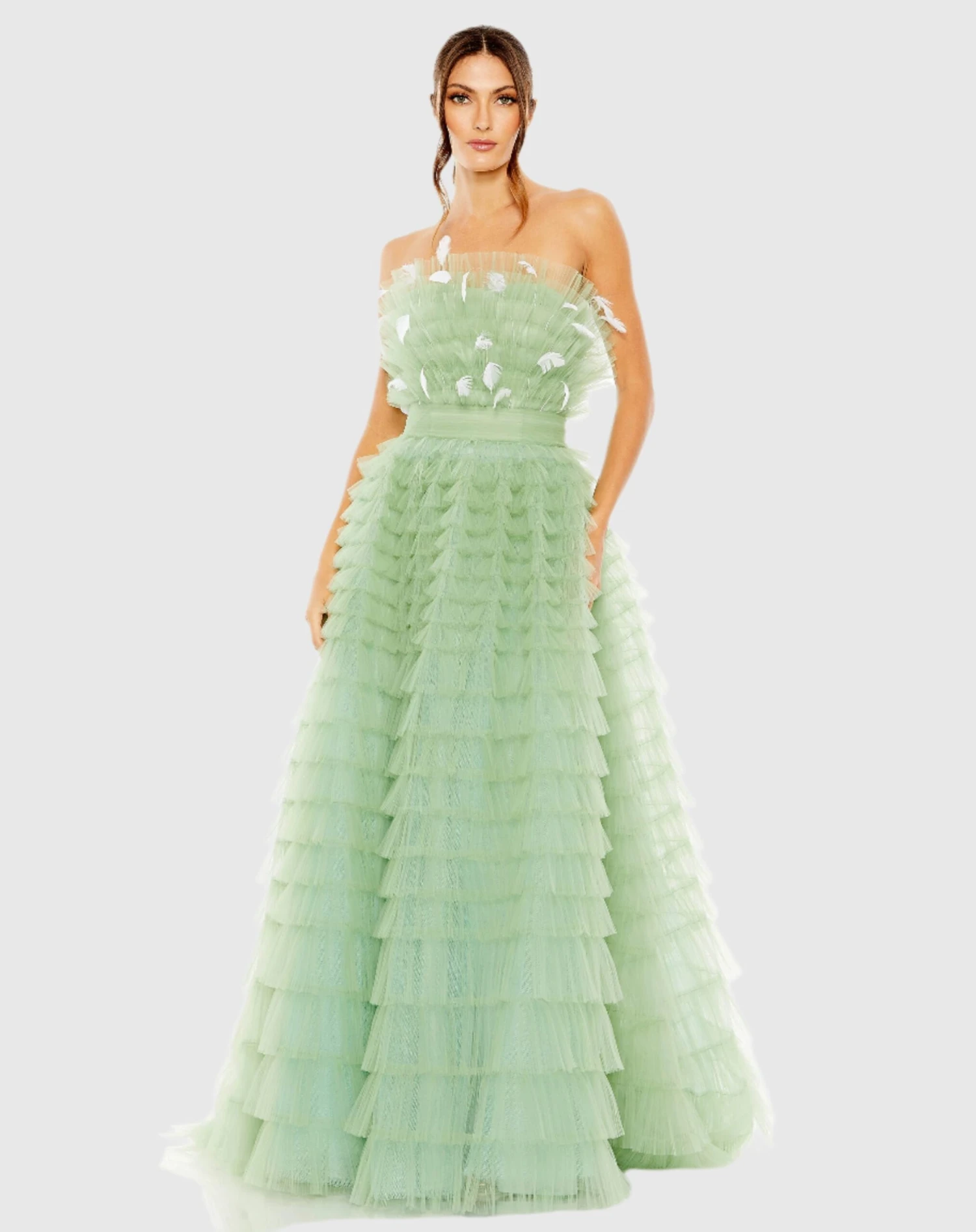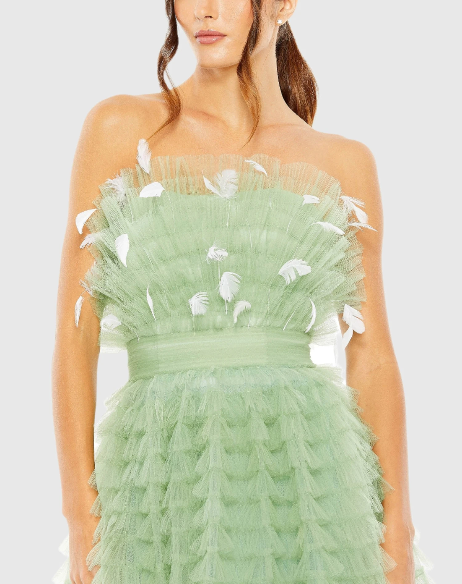 Be the first to review “Strapless Ruffle Gown With Feathers” Cancel reply