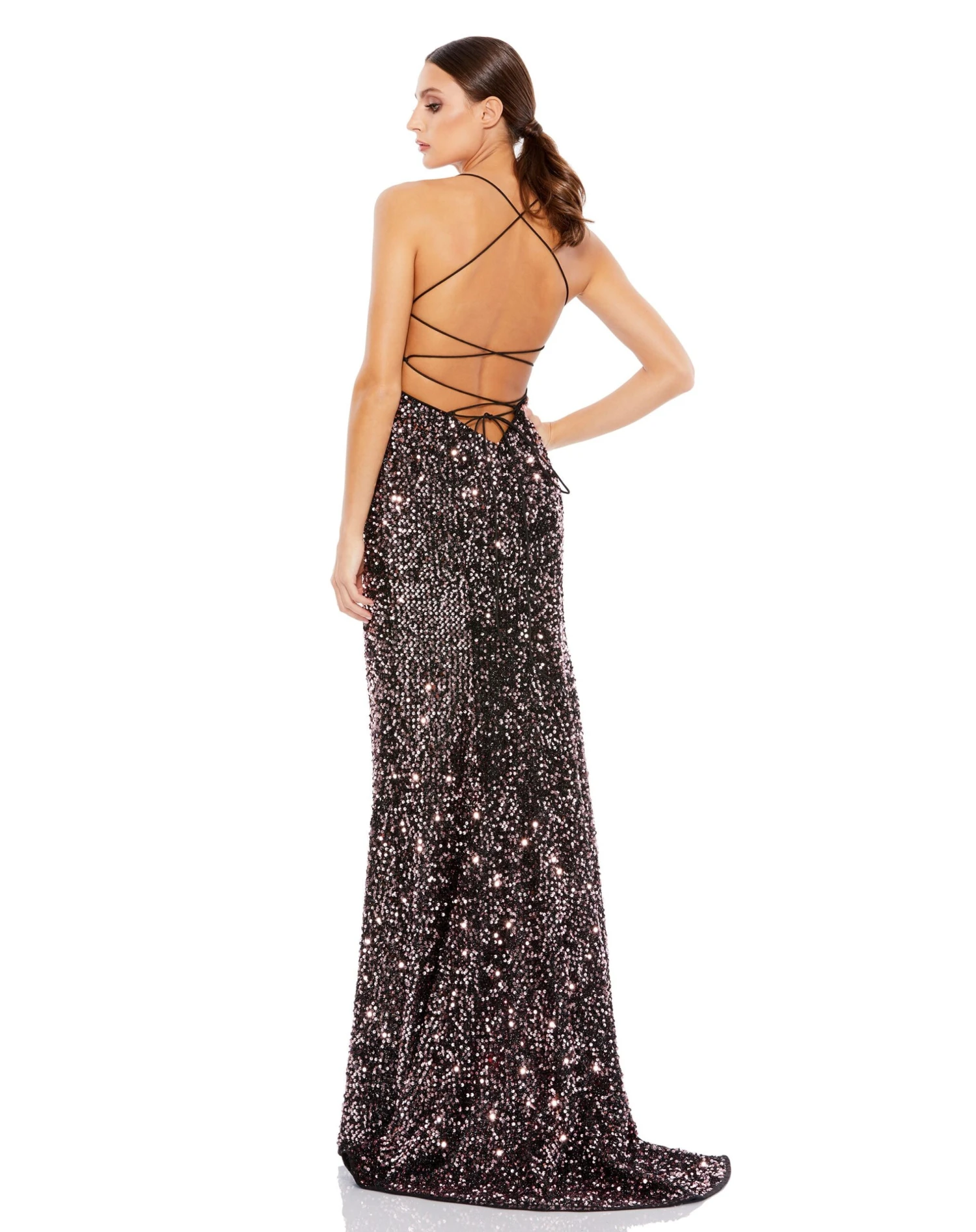 Elegant stretch sequin gown with an intricate open lace-up back.