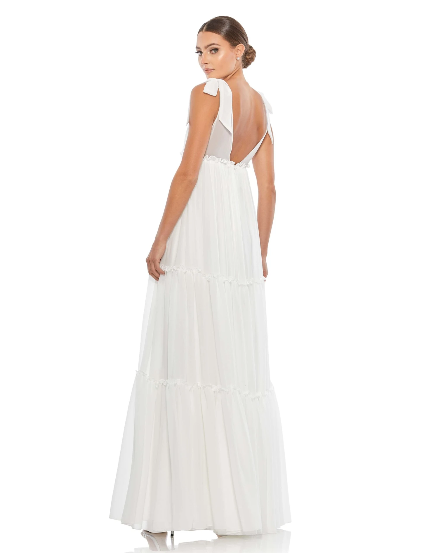 Flowing tiered maxi dress with a plunging v-neckline and tie accents at the shoulder.
