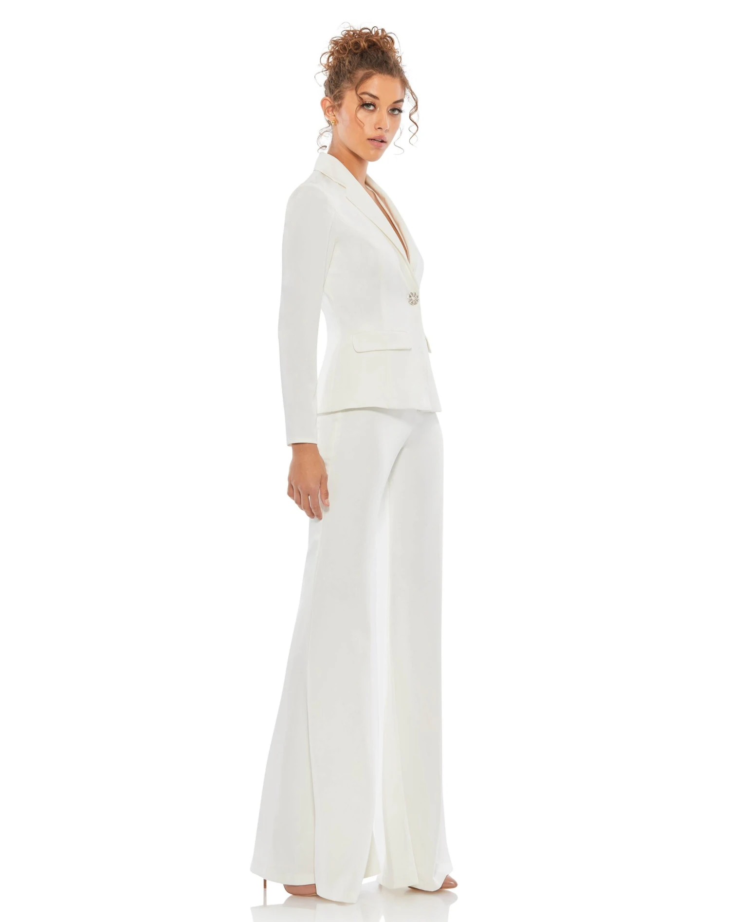 Sexy and feminine two-piece suit with a fitted blazer, deep v-neck, front flap pockets, and a single bejeweled snap button. Full-length pants are fitted through the hip and thigh with a wide flare from the knee down.