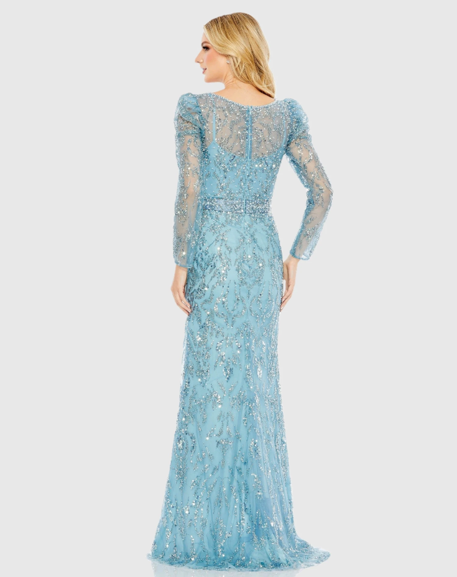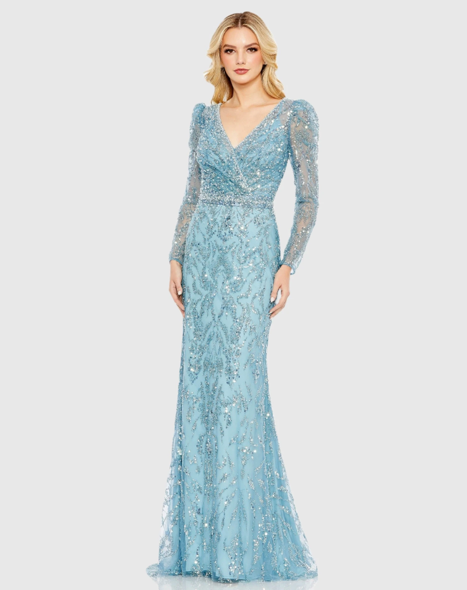 Wrap Around V-Neck Full Sleeve Sequin Embellished Gown